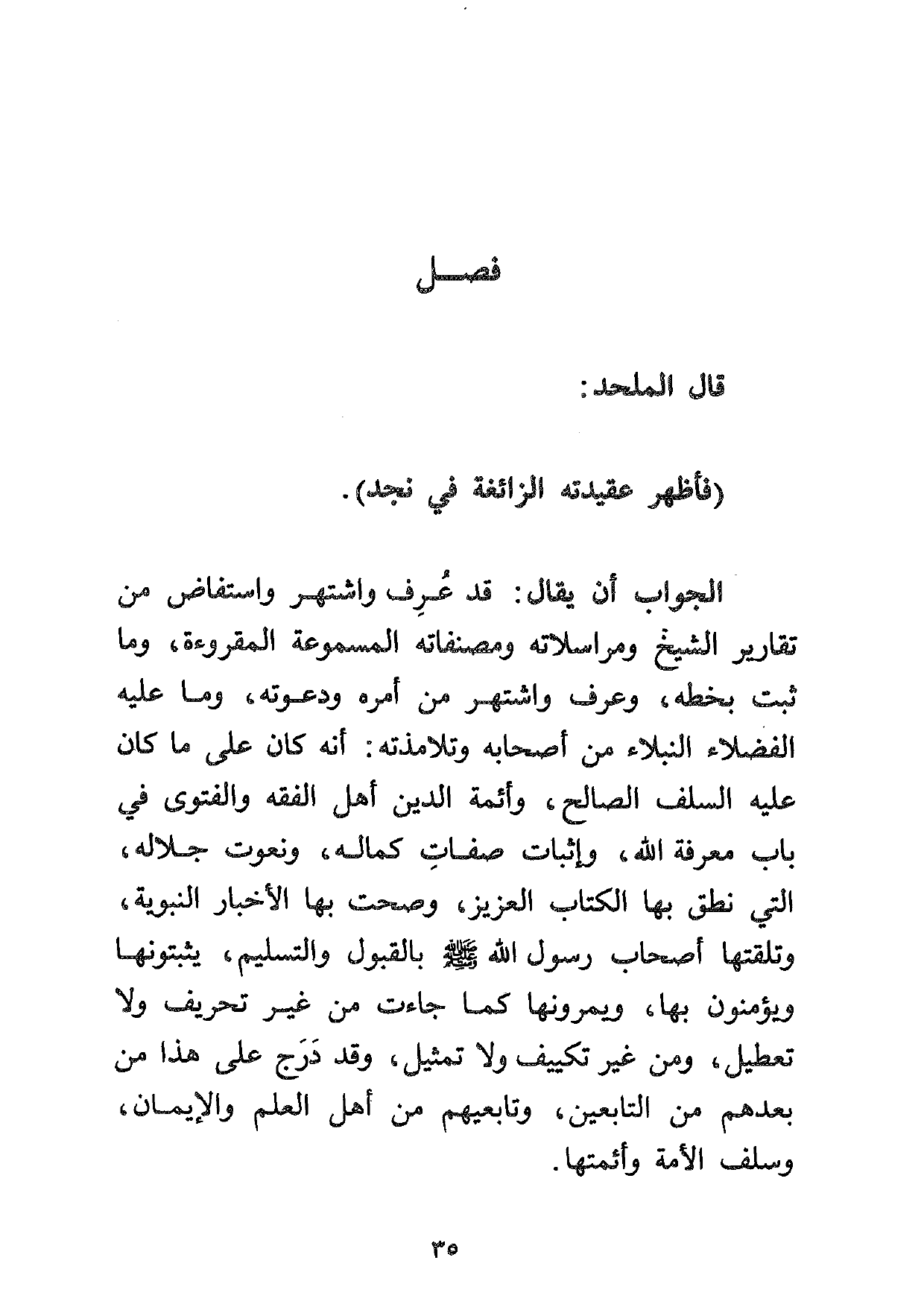 الجواب أن يقال: قد عرف واشتهر واستفاض من تقارير الشيخ ومراسلاته ومصنفاته المسموعة المقروؤة، وما ثبت بخطه، وعرف واشتهر من أمره ودعوته، وما عليه الفضلاء النبلاء من أصحابه وتلامذته: أنه كان على ما كان عليه السلف الصالح، وأئمة الدين أهل الفقة والفتوى في باب معرفة الله، وإثبات صفات كماله، ونعوت جلاله، التي نطق بها الكتاب العزيز، وصحت بها الأخبار النبوية، وتلقتها أصحاب رسول الله صلى الله عليه وسلم بالقبول والتسليم، يثبتونها ويؤمنون بها، ويمرونها كما جاءت من غير تحريف ولا تعطيل، ومن غير تكييف ولا تمثيل، وقد درج على هذا من بعدهم من التابعين، وتابعيهم من أهل العلم والإيمان وسلف الأمة وأئمتها.