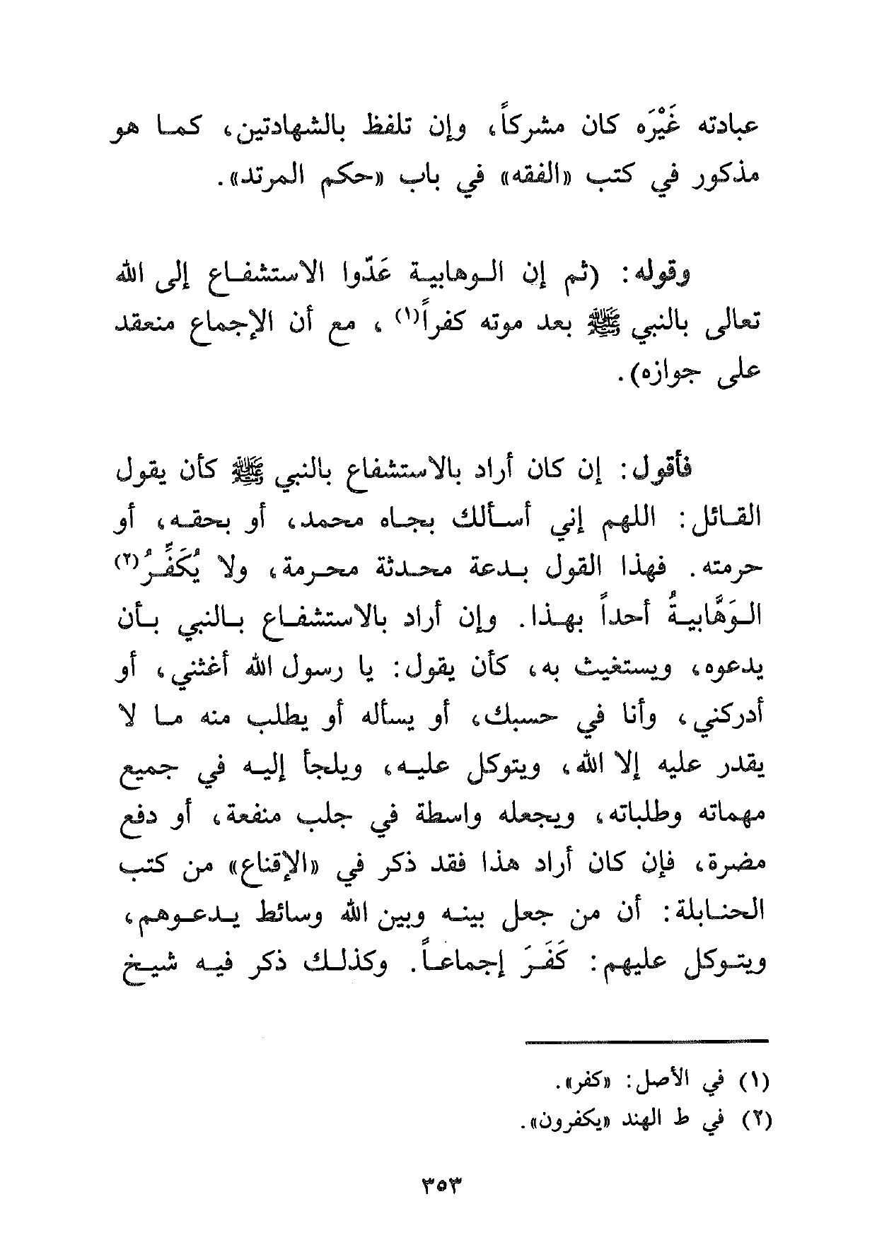 فأقول: إن كان أراد بالاستشفاع بالنبي صلى الله عليه وسلم كأن يقول القائل: اللهم إني أسألك بجاه محمد، أو بحقه، أو حرمته. فهذا القول بدعة محدثة محرمة، ولا يكفر2 الوهابية أحداً بهذا. وإن أراد بالاستشفاع بالنبي بأن يدعوه، ويستغيث به، كأن يقول: يا رسول الله أغثني، أو أدركني، وأنا في حسبك، أو يسأله أو يطلب منه ما لا يقدر عليه إلا الله، ويتوكل عليه، ويلجأ إليه في جميع مهماته وطلباته، ويجعله واسطة في جلب منفعة، أو دفع مضرة، فإن كان أراد هذا فقد ذكر في "الإقناع" من كتب الحنابلة: أن من جعل بينه وبين الله وسائط يدعوهم، ويتوكل عليهم: كفر إجماعاً. وكذلك ذكر فيه شيخ