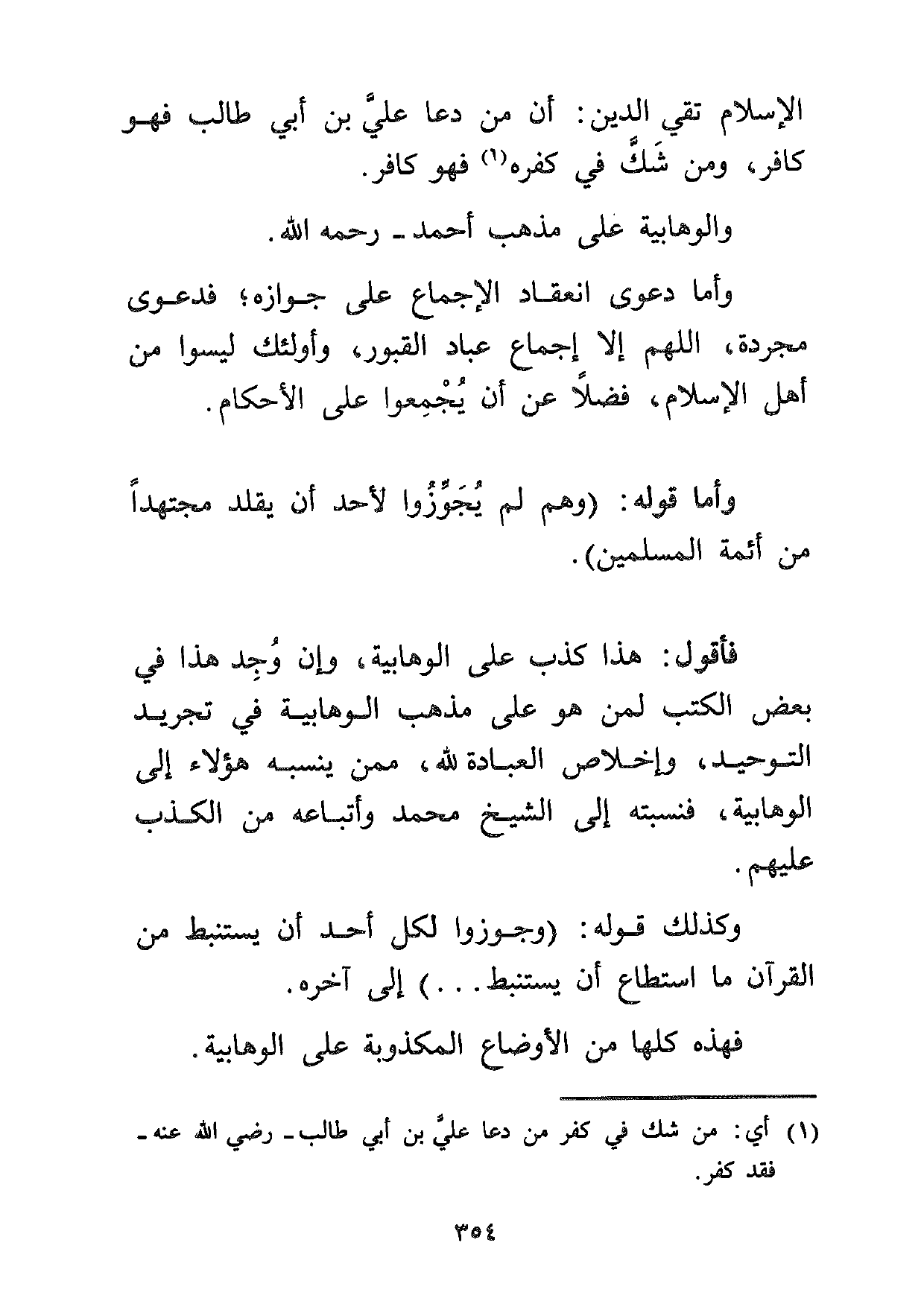 الإسلام تقي الدين: أن من دعا علي بن أبي طالب فهو كافر، ومن شك في كفره1 فهو كافر.