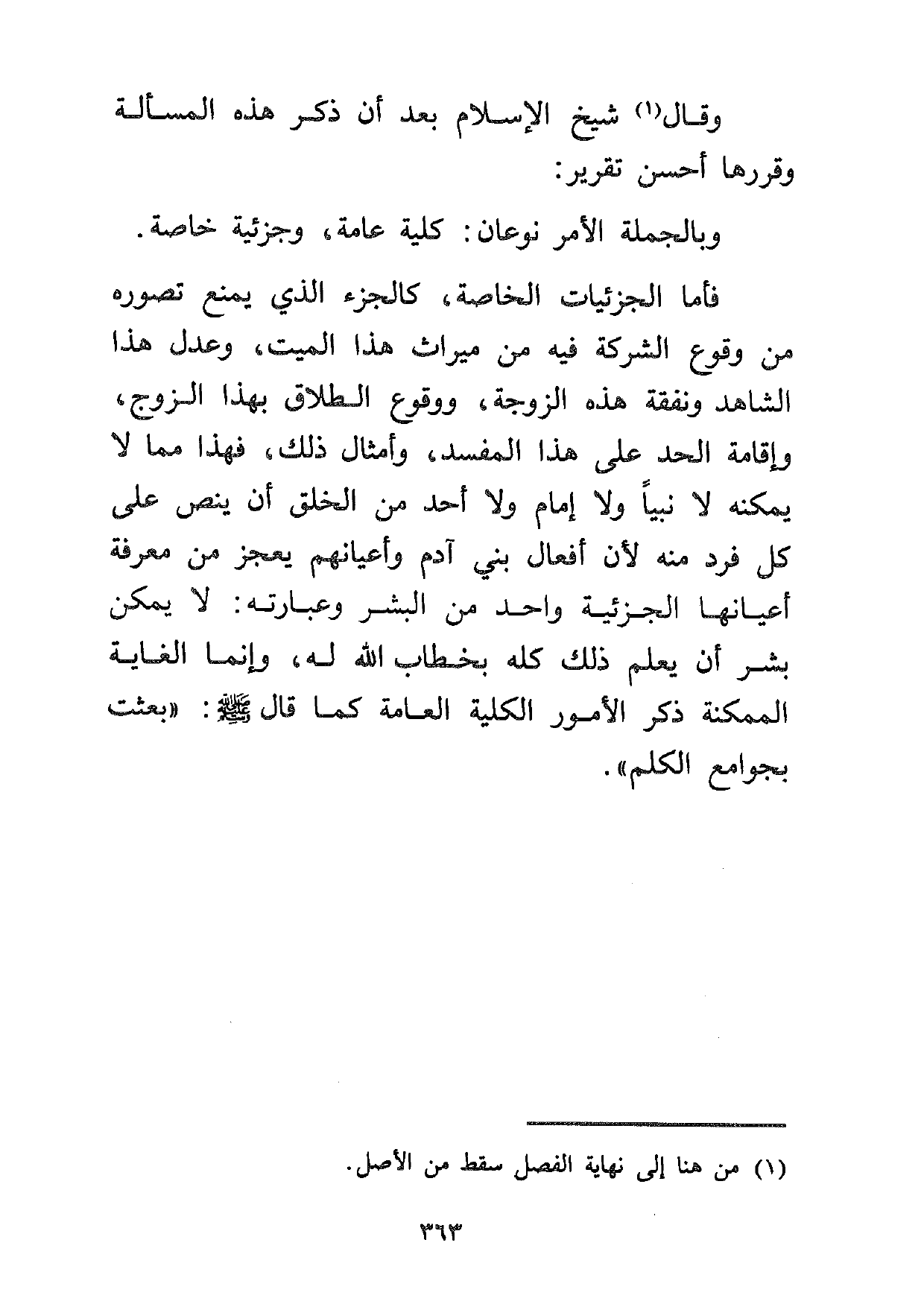 فأما الجزئيات الخاصة، كالجزء الذي يمنع تصوره من وقوع الشركة فيه من ميراث هذا الميت، وعدل هذا الشاهد ونفقة هذه الزوجة، ووقوع الطلاق بهذا الزوج، وإقامة الحد على هذا المفسد، وأمثال ذلك، فهذا مما لا يمكنه لا نبياً ولا إمام ولا أحد من الخلق أن ينص على كل فرد منه لأن أفعال بني آدم وأعيانهم يعجز عن معرفة أعيانها الجزئية واحد من البشر وعبارته: لا يمكن بشر أن يعلم ذلك كله بخطاب الله له، وإنما الغاية الممكنة ذكر الأمور الكلية العامة كما قال صلى الله عليه وسلم: "بعثت بجوامع الكلم".