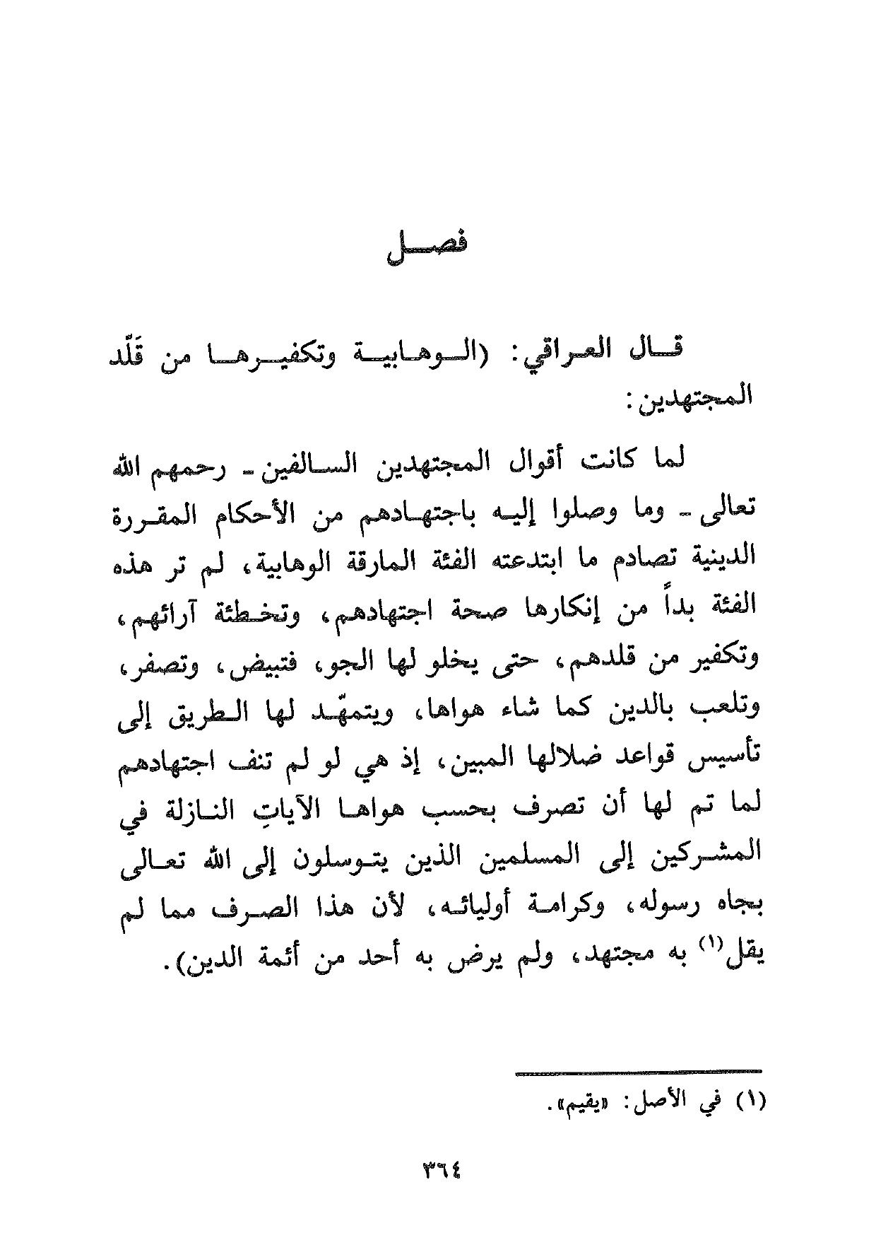 لما كانت أقوال المجتهدين السالفين رحمهم الله تعالى وما وصلوا إليه باجتهادهم من الأحكام المقررة الدينية تصادم ما ابتدعته الفئة المارقة الوهابية، لم تر هذه الفئة بداً من إنكارها صحة اجتهادهم، وتخطئة آرائهم، وتكفير من قلدهم، حتى يخلو لها الجو، فتبيض وتصفر وتلعب بالدين كما شاء هواها، ويتمهد لها الطريق إلى تأسيس قواعد ضلالها المبين، إذ هي لو لم تنف اجتهادهم لما تم لها أن تصرف بحسب هواها الآيات النازلة في المشركين إلى المسلمين الذين يتوسلون إلى الله تعالى بجاه رسوله، وكرامة أوليائه، لأن هذا الصرف مما لم يقل1 به مجتهد، ولم يرض به أحد من أئمة الدين) .