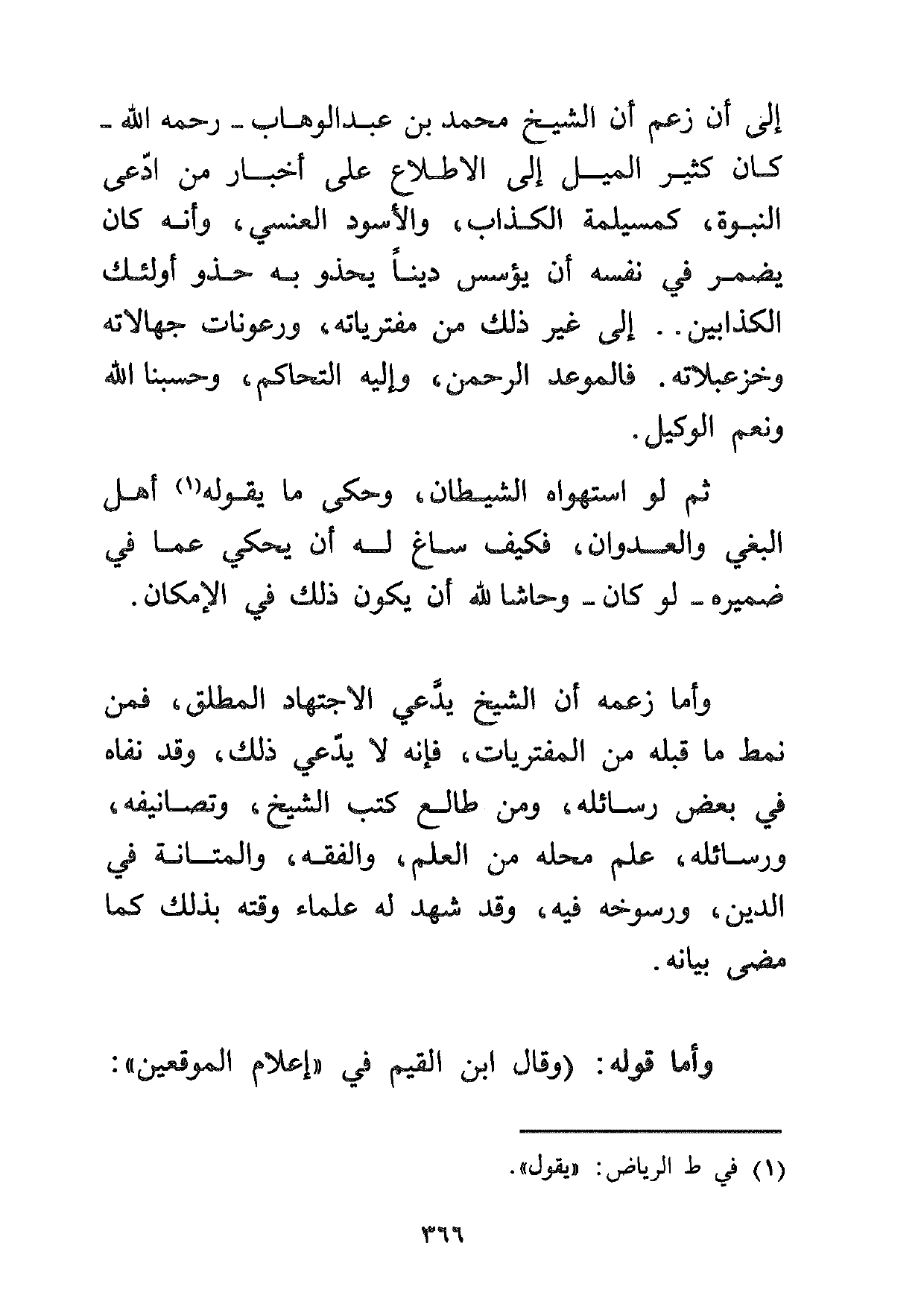 وأما زعمه أن الشيخ يدعي الاجتهاد المطلق، فمن نمط ما قبله من المفتريات، فإنه لا يدعي ذلك، وقد نفاه في بعض رسائله، ومن طالع كتب الشيخ وتصانيفه ورسائله، علم محله من العلم والفقه والمتانة في الدين، ورسوخه فيه، وقد شهد له علماء وقته بذلك كما مضى بيانه.