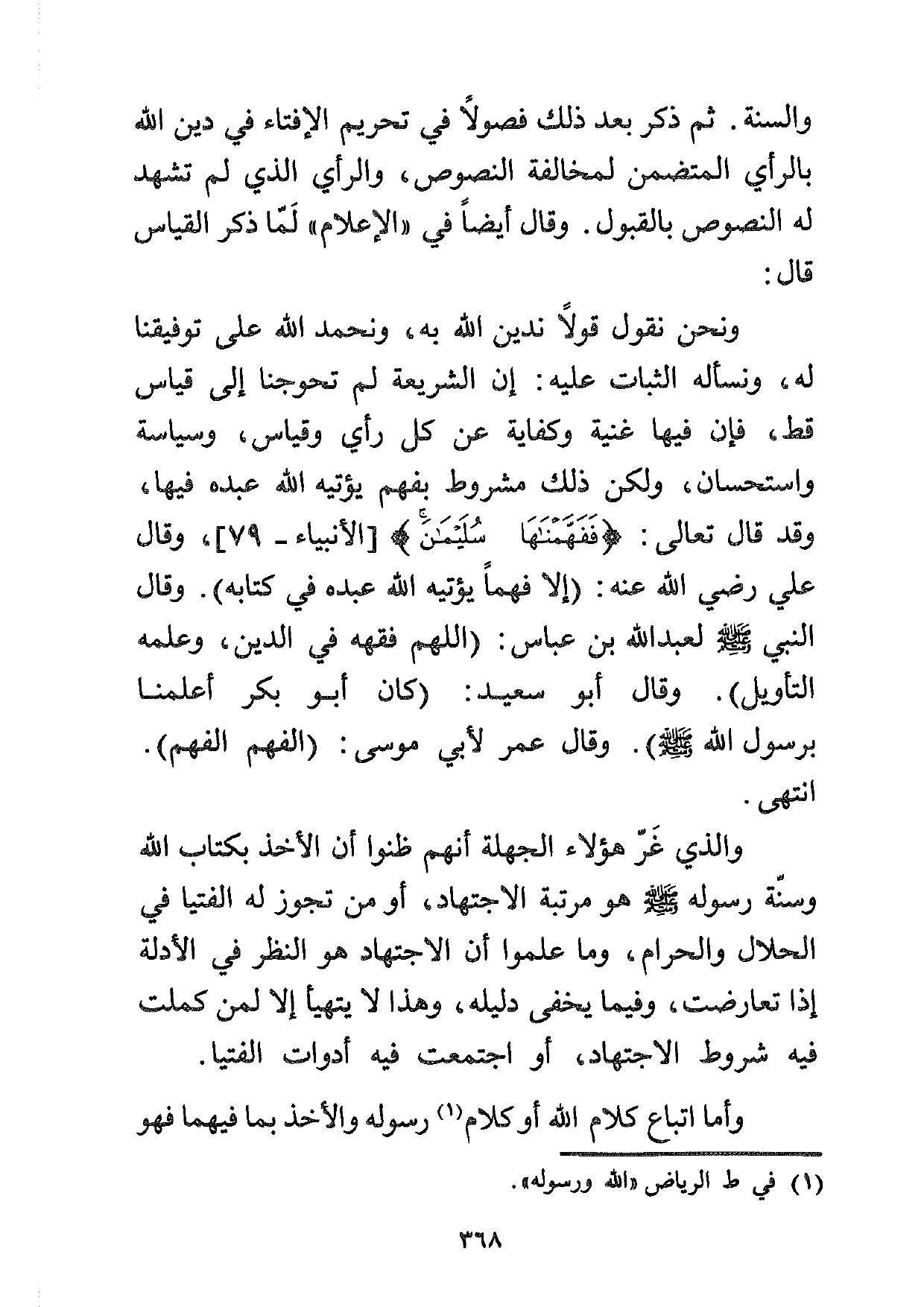 والسنة. ثم ذكر بعد ذلك فصولاً في تحريم الإفتاء في دين الله بالرأي المتضمن لمخالفة النصوص، والرأي الذي لم تشهد له النصوص بالقبول. وقال أيضاً في "الإعلام" لما ذكر القياس قال: