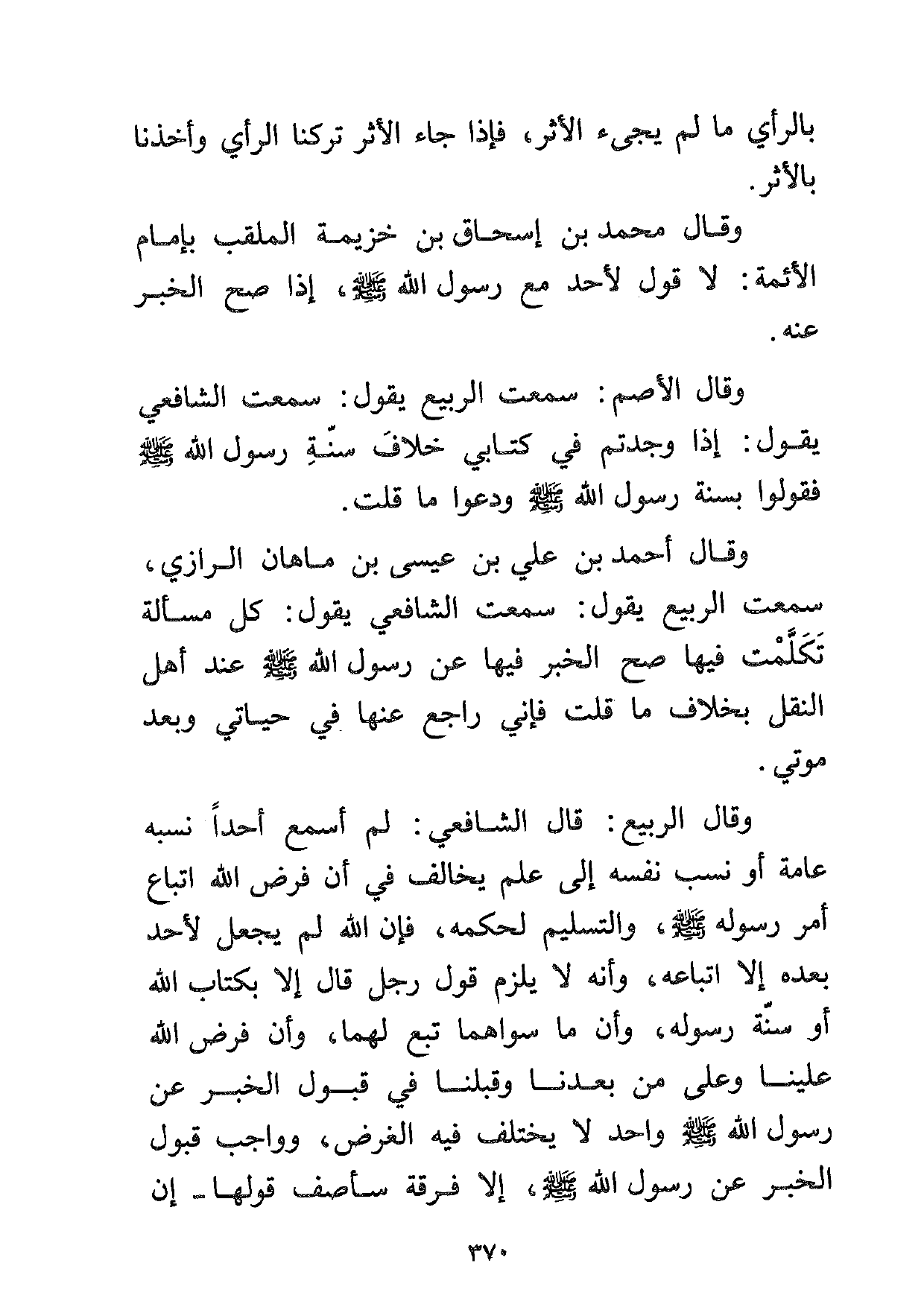 وقال الربيع: قال الشافعي: لم أسمع أحداً نسبه عامة أو نسب نفسه إلى علم يخالف في أن فرض الله اتباع أمر رسوله صلى الله عليه وسلم، والتسليم لحكمه، فإن الله لم يجعل لأحد بعده إلا اتباعه، وأنه لا يلزم قول رجل قال إلا بكتاب الله أو سنة رسوله، وأن ما سواهما تبع لهما، وأن فرض الله علينا وعلى من بعدنا وقبلنا في قبول الخبر عن رسول الله صلى الله عليه وسلم واحد لا يختلف فيه الغرض، وواجب قبول الخبر عن رسول الله صلى الله عليه وسلم، إلا فرقة سأصف قولها -إن