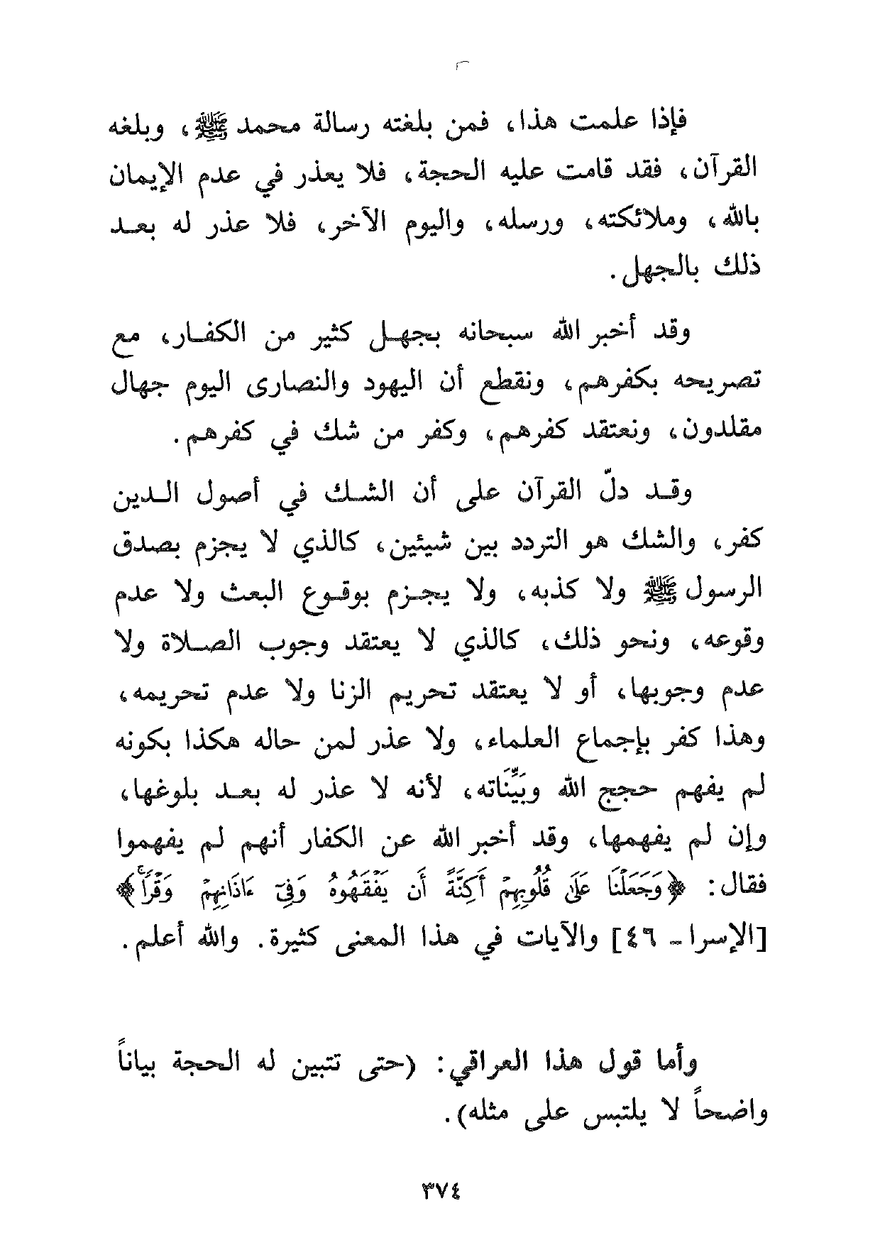 فإذا علمت هذا، فمن بلغته رسالة محمد صلى الله عليه وسلم، وبلغه القرآن، فقد قامت عليه الحجة، فلا يعذر في عدم الإيمان بالله وملائكته ورسله، واليوم الآخر، فلا عذر له بعد ذلك بالجهل.