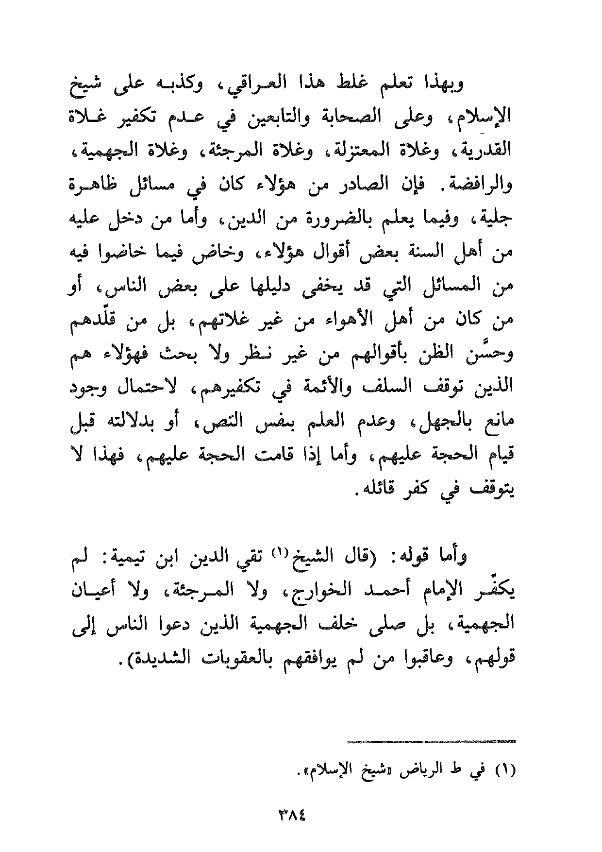 وبهذا تعلم غلط هذا العراقي، وكذبه على شيخ الإسلام، وعلى الصحابة والتابعين في عدم تكفير غلاة القدرية وغلاة المعتزلة، وغلاة المرجئة، وغلاة الجهمية، والرافضة. فإن الصادر من هؤلاء كان في مسائل ظاهرة جلية، وفيما يعلم بالضرورة من الدين، وأما من دخل عليه من أهل السنة بعض أقوال هؤلاء، وخاض فيما خاضوا فيه من المسائل التي قد يخفى دليلها على بعض الناس، أو من كان من أهل الأهواء من غير غلاتهم، بل من قلدهم وحسن الظن بأقوالهم من غير نظر ولا بحث فهؤلاء هم الذين توقف السلف والأئمة في تكفيرهم، لاحتمال وجود مانع بالجهل، وعدم العلم بنفس النص، أو بدلالته قبل قيام الحجة عليهم، وأما إذا قامت الحجة عليهم، فهذا لا يتوقف في كفر قائله.