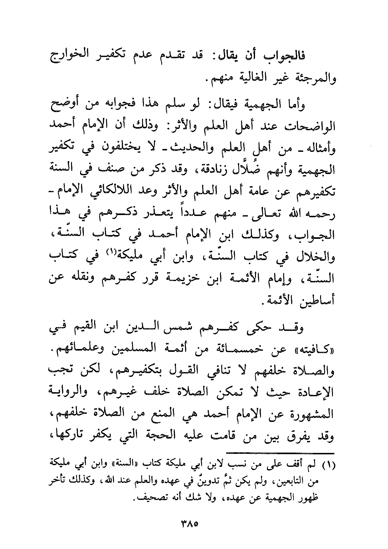 وأما الجهمية فيقال: لو سلم هذا فجوابه من أوضح الواضحات عند أهل العلم والأثر: وذلك أن الإمام أحمد وأمثاله -من أهل العلم والحديث- لا يختلفون في تكفير الجهمية وأنهم ضلال زنادقة، وقد ذكر من صنف في السنة تكفيرهم عن عامة أهل العلم والأثر وعد اللالكائي الإمام رحمه الله تعالى منهم عدداً يتعذر ذكرهم في هذا الجواب، وكذلك ابن الإمام أحمد في كتاب السنة، والخلال في كتاب السنة، وابن أبي مليكة1 في كتاب السنة، وإمام الأئمة ابن خزيمة قرر كفرهم ونقله عن أساطين الأئمة.