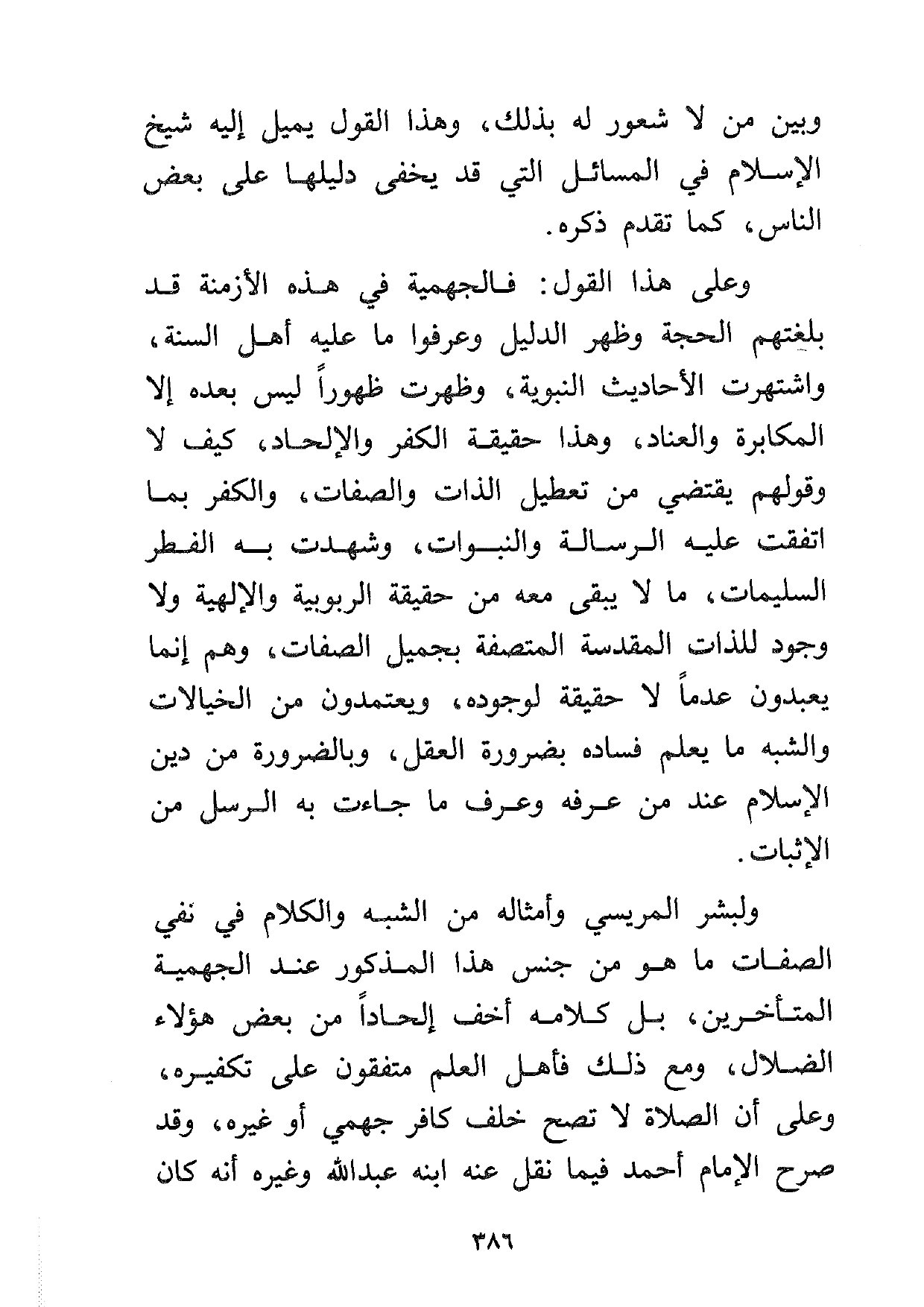 ولبشر المريسي وأمثاله من الشبه والكلام في نفي الصفات ما هو من جنس هذا المذكور عند الجهمية المتأخرين، بل كلامه أخف إلحاداً من بعض هؤلاء الضلال، ومع ذلك فأهل العلم متفقون على تكفيره، وعلى أن الصلاة لا تصح خلف كافر جهمي أو غيره، وقد صرح الإمام أحمد فيما نقل عنه ابنه عبد الله وغيره أنه كان