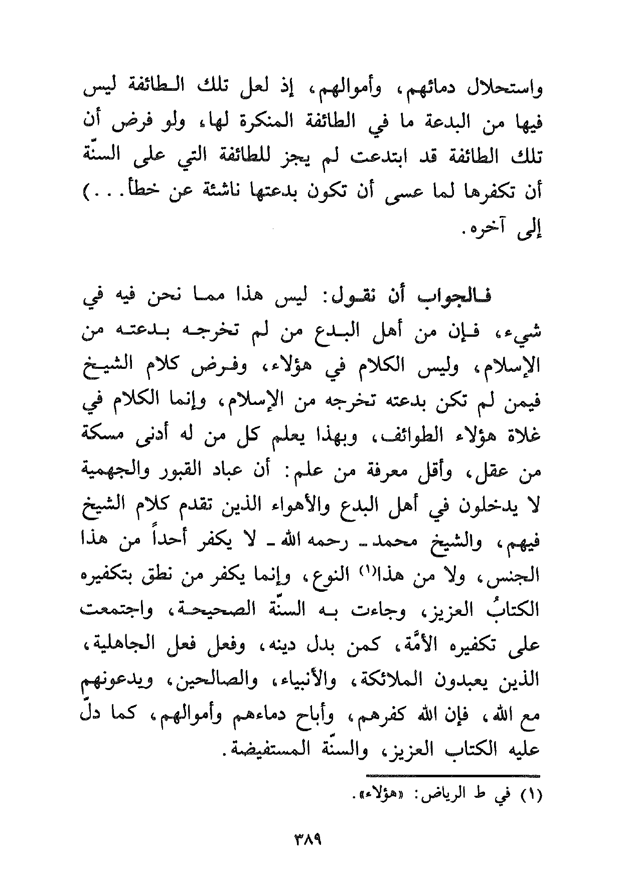 واستحلال دمائهم وأموالهم، إذ لعل تلك الطائفة ليس فيها من البدعة ما في الطائفة المنكرة لها، ولو فرض أن تلك الطائفة قد ابتدعت لم يجز للطائفة التي على السنة أن تكفرها لما عسى أن تكون بدعتها ناشئة عن خطأ ... ) إلى آخره.