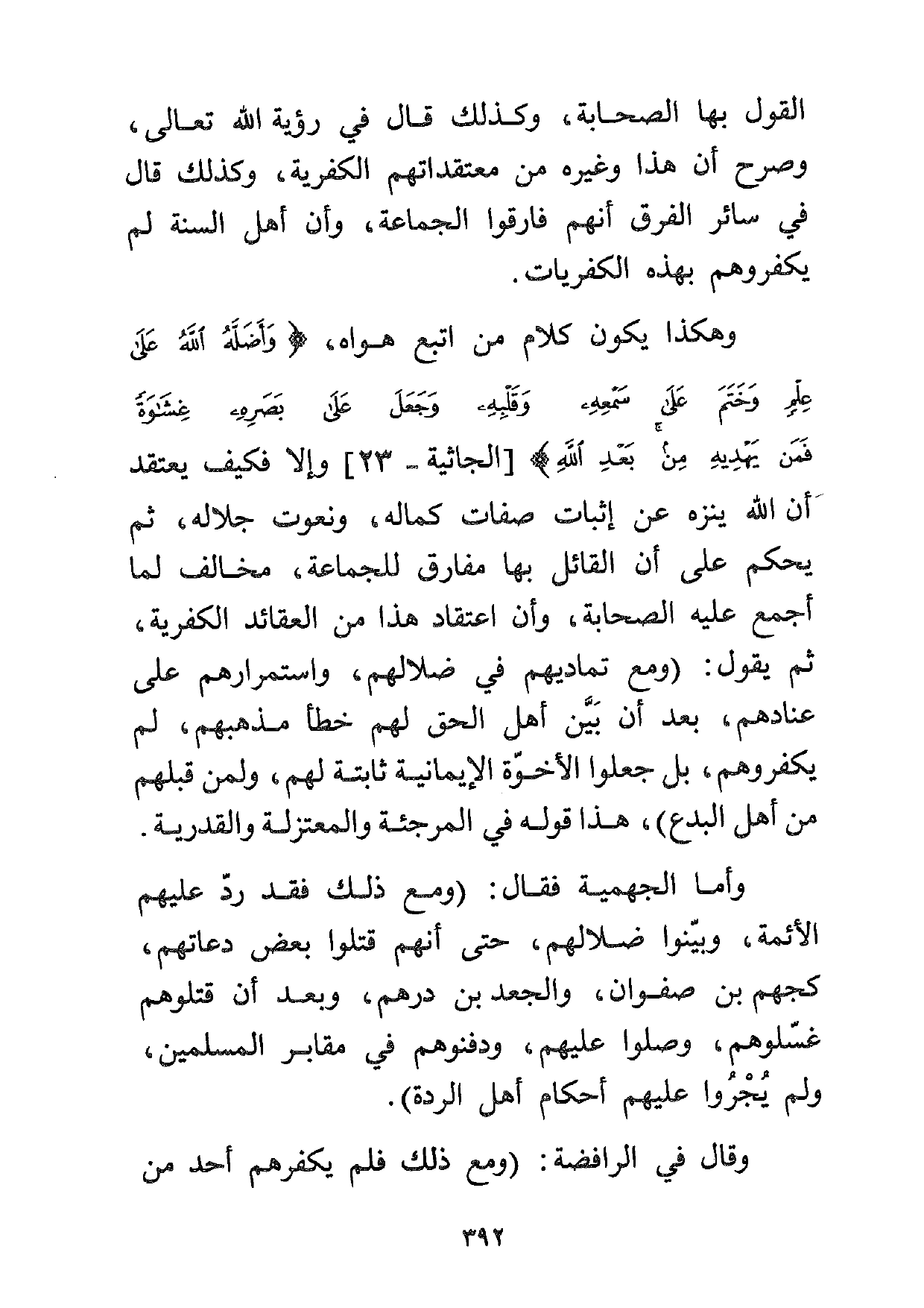 القول بها الصحابة، وكذلك قال في رؤية الله تعالى، وصرح أن هذا وغيره من معتقداتهم الكفرية، وكذلك قال في سائر الفرق أنهم فارقوا الجماعة، وأن أهل السنة لم يكفروهم بهذه الكفريات.