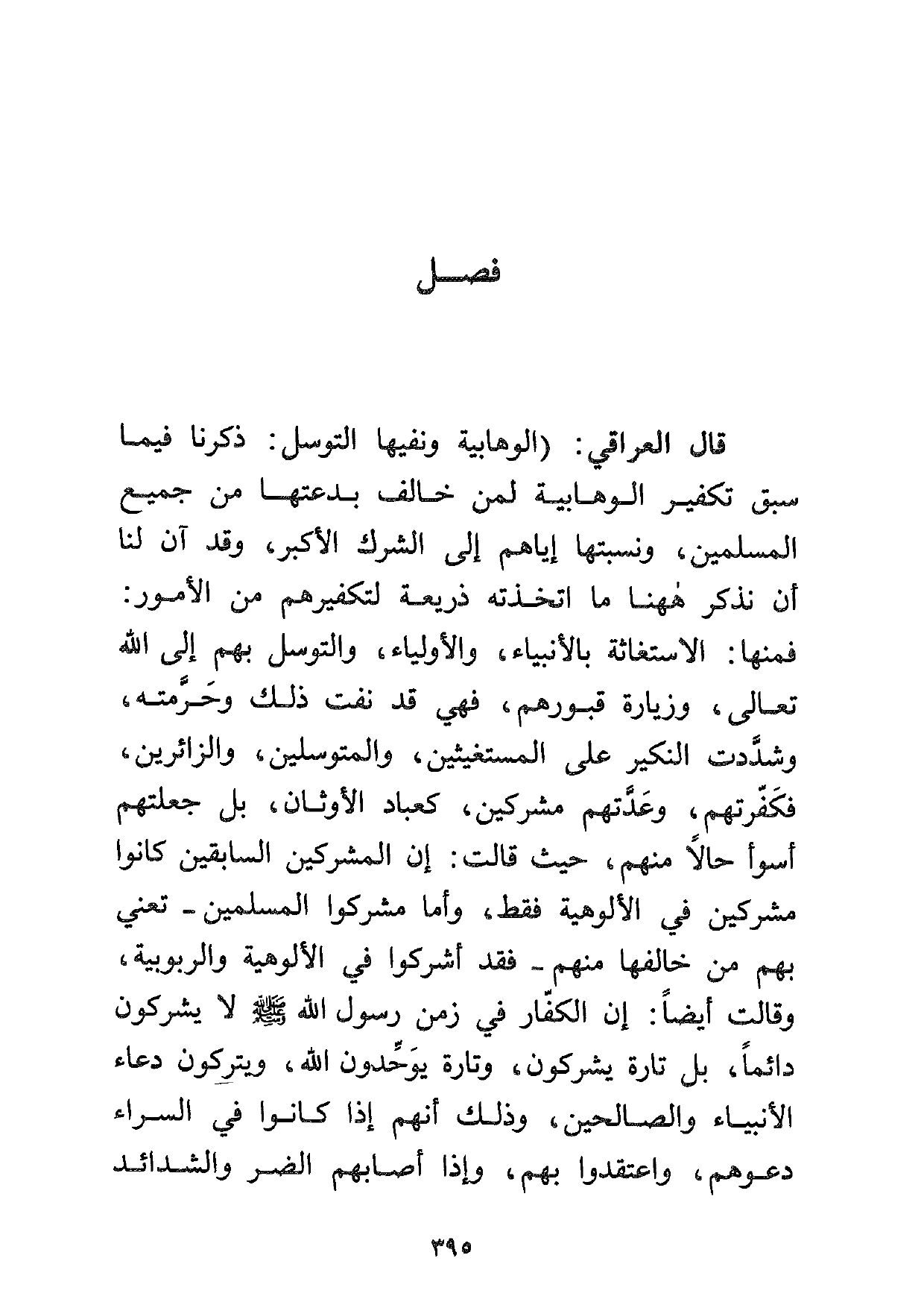 قال العراقي: (الوهابية، ونفيها التوسل: ذكرنا فيما سبق تكفير الوهابية لمن خالف بدعتها من جميع المسلمين، ونسبتها إياهم إلى الشرك الأكبر، وقد آن لنا أن نذكر ههنا ما اتخذته ذريعة لتكفيرهم من الأمور: فمنها: الاستغاثة بالأنبياء والأولياء، والتوسل بهم إلى الله تعالى، وزيارة قبورهم، فهي قد نفت ذلك وحرمته، وشددت النكير على المستغيثين والمتوسلين والزائرين فكفرتهم وعدتهم مشركين، كعباد الأوثان، بل جعلتهم أسوأ حالاً منهم، حيث قالت: إن المشركين السابقين كانوا مشركين في الألوهية فقط، وأما مشركوا المسملين -تعني بهم من خالفها منهم- فقد أشركوا في الألوهية والربوبية، وقالت أيضاً: إن الكفار في زمن رسول الله صلى الله عليه وسلم لا يشركون دائماً، بل تارة يشركون، وتارة يوحدون الله، ويتركون دعاء الأنبياء والصالحين، وذلك أنهم إذا كانوا في السراء دعوهم، واعتقدوا بهم، وإذا أصابهم الضر والشدائد