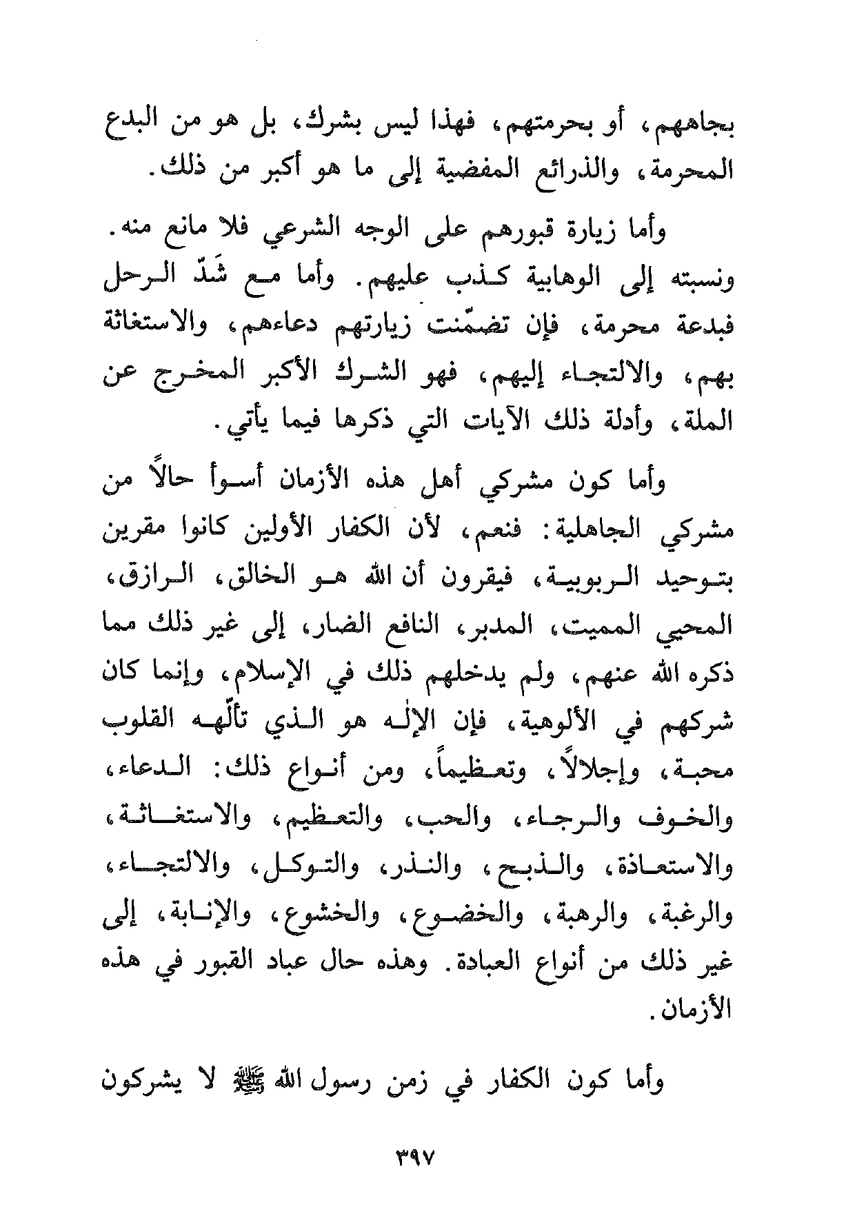وأما زيارة قبورهم على الوجه الشرعي، فلا مانع منه. ونسبته إلى الوهابية كذب عليهم. وأما مع شد الرحل فبدعة محرمة، فإن تضمنت زيارتهم دعاءهم والاستغاثة بهم، والالتجاء إليهم، فهو الشرك الأكبر المخرج عن الملة، وأدلة ذلك الآيات التي ذكرها فيما يأتي.
