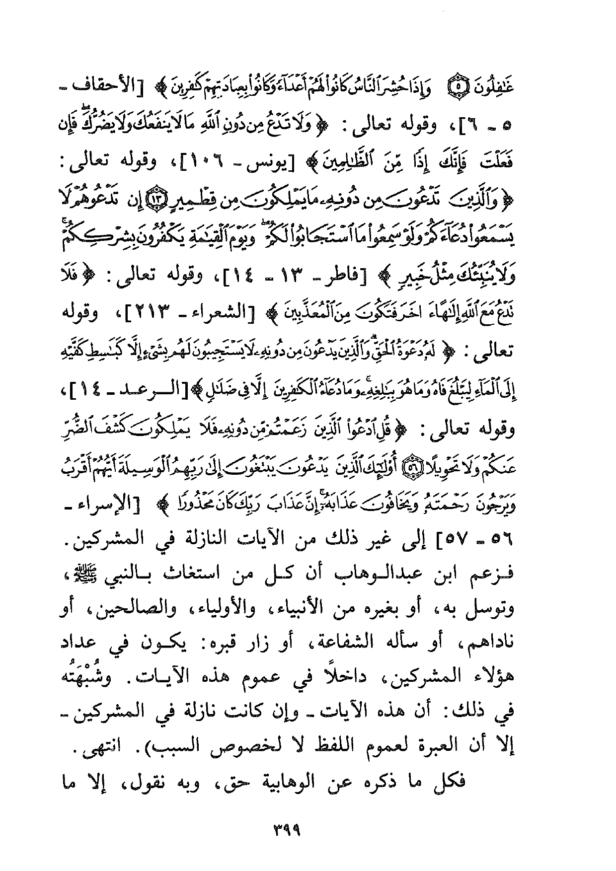 فزعم ابن عبد الوهاب أن كل من استغاث بالنبي صلى الله عليه وسلم، وتوسل به أو بغيره من الأنبياء والأولياء والصالحين، أو ناداهم أو سأله الشفاعة، أو زار قبره: يكون في عداد هؤلاء المشركين، داخلاً في عموم هذه الآيات. وشبهته في ذلك: أن هذه الآيات -وإن كانت نازلة في المشركين- إلا أن العبرة لعموم اللفظ لا لخصوص السبب) انتهى.