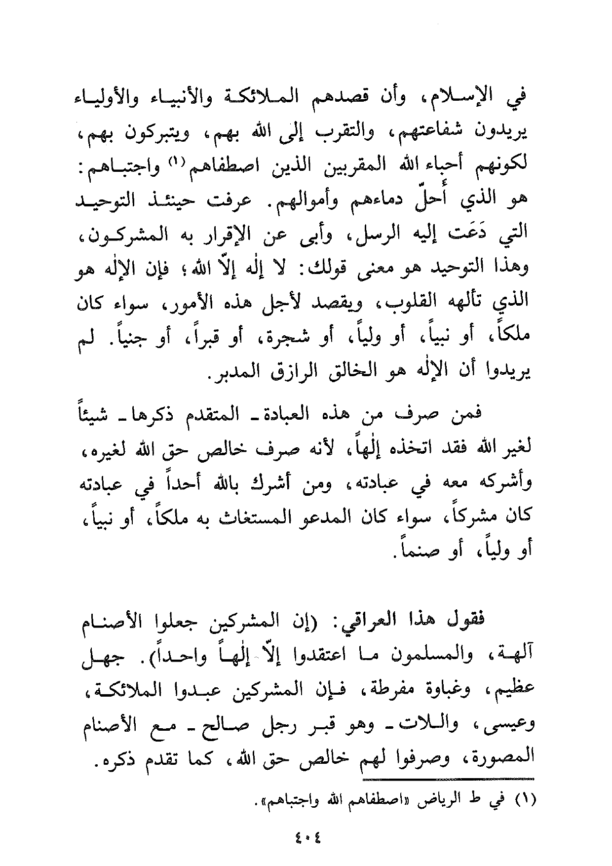 فقول هذا العراقي: (إن المشركين جعلوا الأصنام آلهة، والمسلمون ما اعتقدوا إلا إلهاً واحداً) . جهل عظيم، وغباوة مفرطة، فإن المشركين عبدوا الملائكة، وعيسى واللات -وهو قبر رجل صالح- مع الأصنام المصورة، وصرفوا لهم خالص حق الله، كما تقدم ذكره.