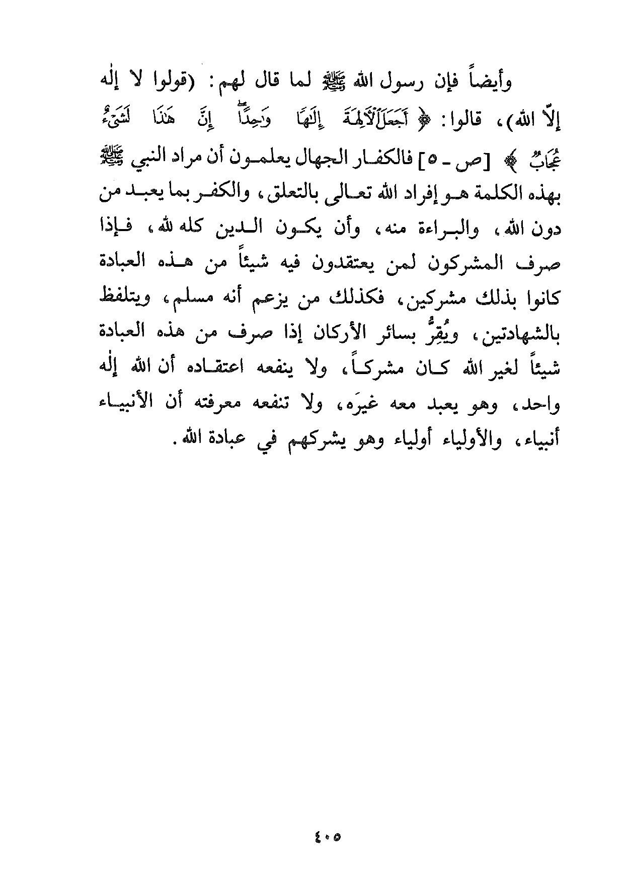 وأيضاً فإن رسول الله صلى الله عليه وسلم لما قال لهم: "قولوا لا إله إلا الله"، قالوا: {أَجَعَلَ الآلِهَةَ إِلَهاً وَاحِداً إِنَّ هَذَا لَشَيْءٌ عُجَابٌ} [ص:5] ، فالكفار الجهال يعلمون أن مراد النبي صلى الله عليه وسلم بهذه الكلمة هو إفراد الله تعالى بالتعلق، والكفر بما يعبد من دون الله، والبراءة منه، وأن يكون الدين كله لله، فإذا صرف المشركون لمن يعتقدون فيه شيئاً من هذه العبادة كانوا بذلك مشركين، فكذلك من يزعم أنه مسلم، ويتلفظ بالشهادتين، ويقر بسائر الأركان إذا صرف من هذه العبادة شيئاً لغير الله كان مشركاً، ولا ينفعه اعتقاده أن الله إله واحد، وهو يعبد معه غيره، ولا تنفعه معرفته أن الأنبياء أنبياء، والأولياء أولياء وهو يشركهم في عبادة الله.