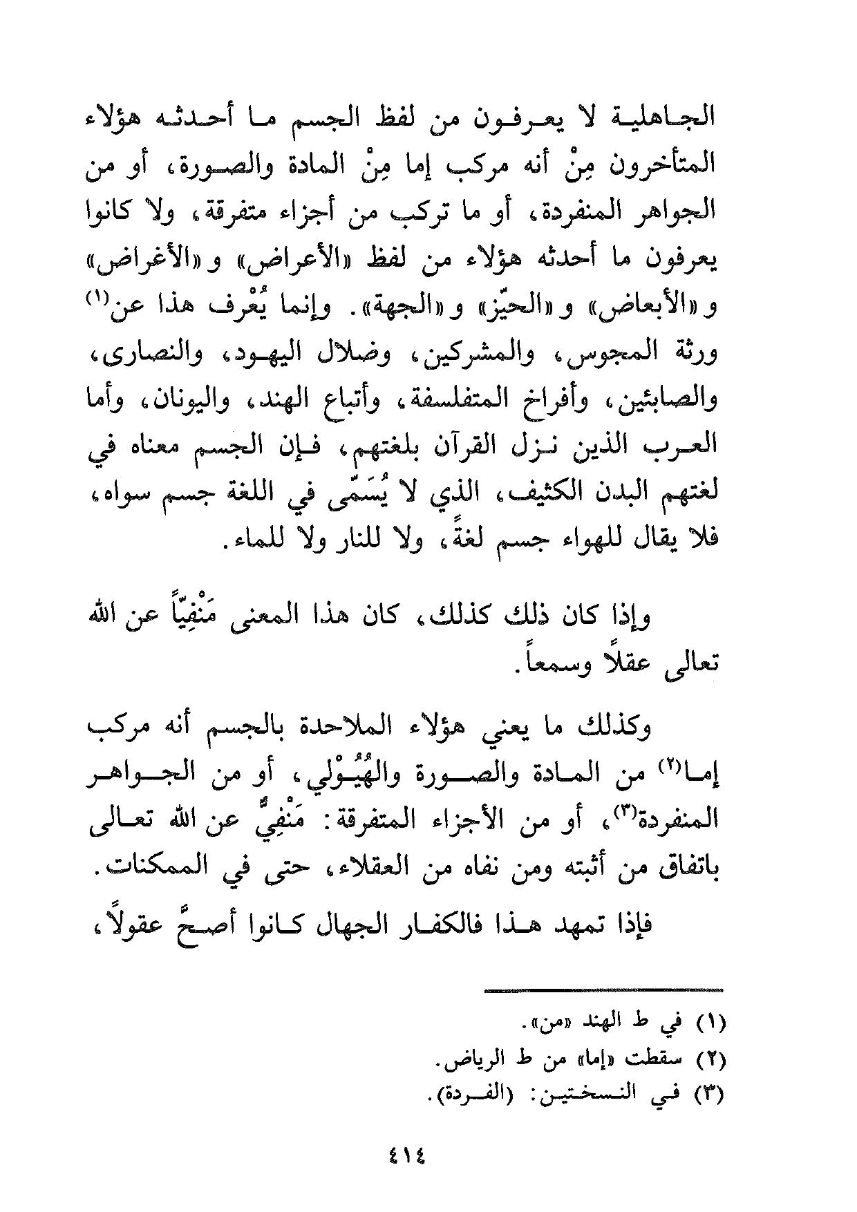 وكذلك ما يعني هؤلاء الملاحدة بالجسم أنه مركب إما2 من المادة والصورة والهيولي، أو من الجواهر المنفردة3، أو من الأجزاء المتفرقة: منفي عن الله تعالى باتفاق من أثبته ومن نفاه من العقلاء، حتى في الممكنات.