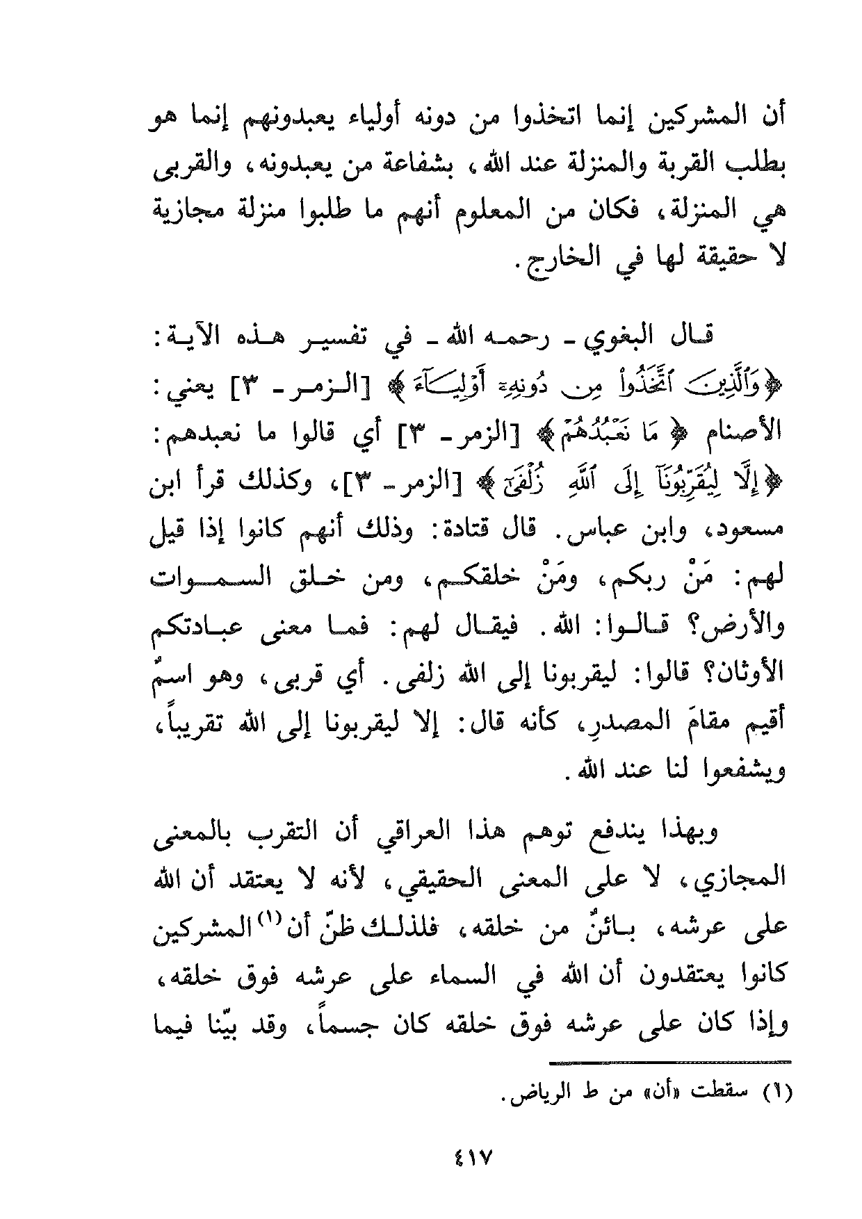 وبهذا يندفع توهم هذا العراقي أن التقرب بالمعنى المجازي، لا على المعنى الحقيقي، لأنه لا يعتقد أن الله على عرشه، بائن من خلقه، فلذلك ظن أن1 المشركين كانوا يعتقدون أن الله في السماء على عرشه فوق خلقه، وإذا كان على عرشه فوق خلقه كان جسماً، وقد بينا فيما