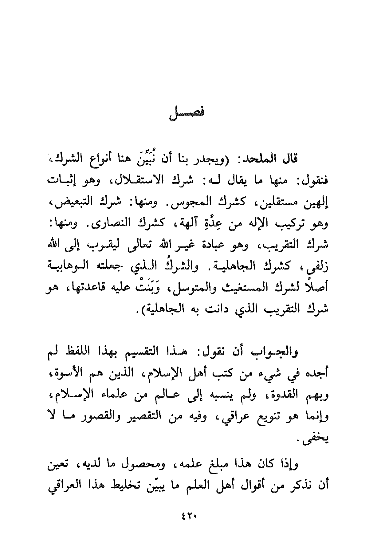 قال الملحد: (ويجدر بنا أن نبين هنا أنواع الشرك، فنقول: منها ما يقال له: شرك الاستقلال، وهو إثبات إلهين مستقلين، كشرك المجوس. ومنها: شرك التبعيض، وهو تركيب الإله من عدة آلهة، كشرك النصارى. ومنها: شرك التقريب، وهو عبادة غير الله تعالى ليقرب إلى الله زلفى، كشرك الجاهلية. والشرك الذي جعلته الوهابية أصلاً لشرك المستغيث والمتوسل، وبنت عليه قاعدتها، هو شرك التقريب الذي دانت به الجاهلية) .
