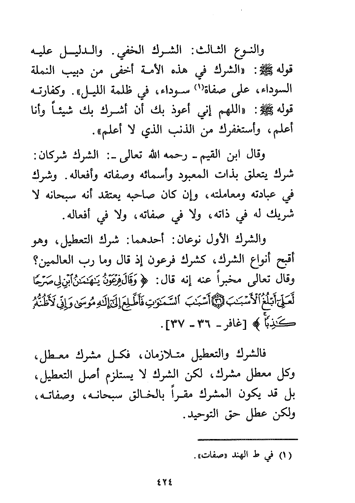 والنوع الثالث: الشرك الخفي. والدليل عليه قوله صلى الله عليه وسلم: "الشرك في هذه الأمة أخفى من دبيب النملة السوداء، على صفاة1 سوداء، في ظلمة الليل". وكفارته قوله صلى الله عليه وسلم: "اللهم إني أعوذ بك أن أشرك بك شيئاً وأنا أعلم، وأستغفرك من الذنب الذي لا أعلم".