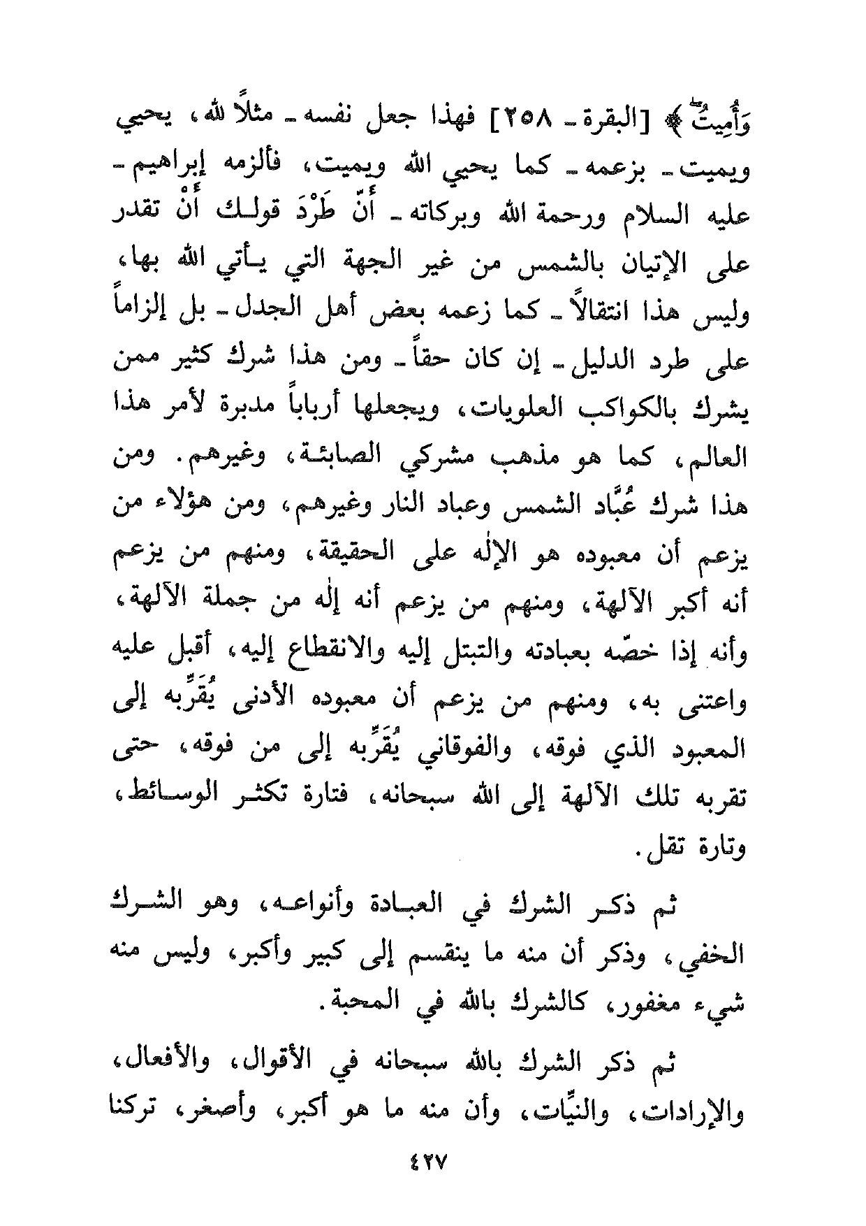 وَأُمِيتُ} [البقرة: 258] فهذا جعل نفسه -مثلاً لله، يحيى ويمين -بزعمه- كما يحيى الله ويميت، فألزمه إبراهيم -عليه السلام ورحمة الله وبركاته- أن طرد قولك أن تقدر على الإتيان بالشمس من غير الجهة التي يأتي الله بها، وليس هذا انتقالاً -كما زعمه بعض أهل الجدل- بل إلزاماً على طرد الدليل -إن كان حقاً- ومن هذا شرك كثير ممن يشرك بالكواكب العلويات، ويجعلها أرباباً مدبرة لأمر هذا العالم، كما هو مذهب مشركي الصابئة، وغيرهم. ومن هذا شرك عباد الشمس وعباد النار وغيرهم، ومن هؤلاء من يزعم أن معبوده هو الإله على الحقيقة، ومنهم من يزعم أنه أكبر الآلهة، ومنهم من يزعم أنه إله من جملة الآلهة، وأنه إذا خصه بعبادته والتبتل إليه والانقطاع إليه، أقبل عليه واعتنى به، ومنهم من يزعم أن معبوده الأدنى يقربه إلى المعبود الذي فوقه، والفوقاني يقربه إلى من فوقه، حتى تقربه تلك الآلهة إلى الله سبحانه، فتارة تكثر الوسائط، وتارة تقل.