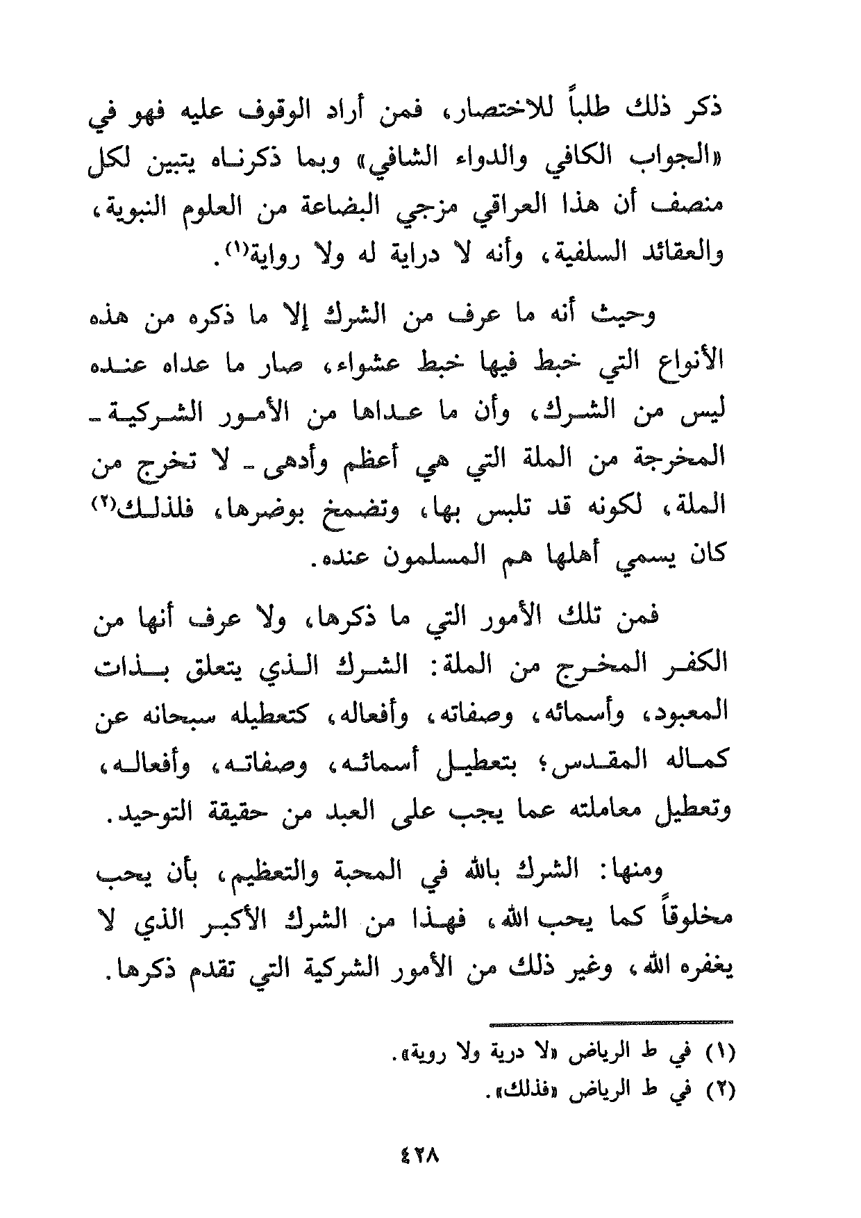 وحيث أنه ما عرف من الشرك إلا ما ذكره من هذه الأنواع التي خبط فيها خبط عشواء، صار ما عداه عنده ليس من الشرك، وأن ما عداها من الأمور الشركية -المخرجة من الملة التي هي أعظم وأدهى- لا تخرج من الملة، لكونه قد تلبس بها، وتضمخ بوضرها، فلذلك2 كان يسمي أهلها هم المسلمون عنده.
