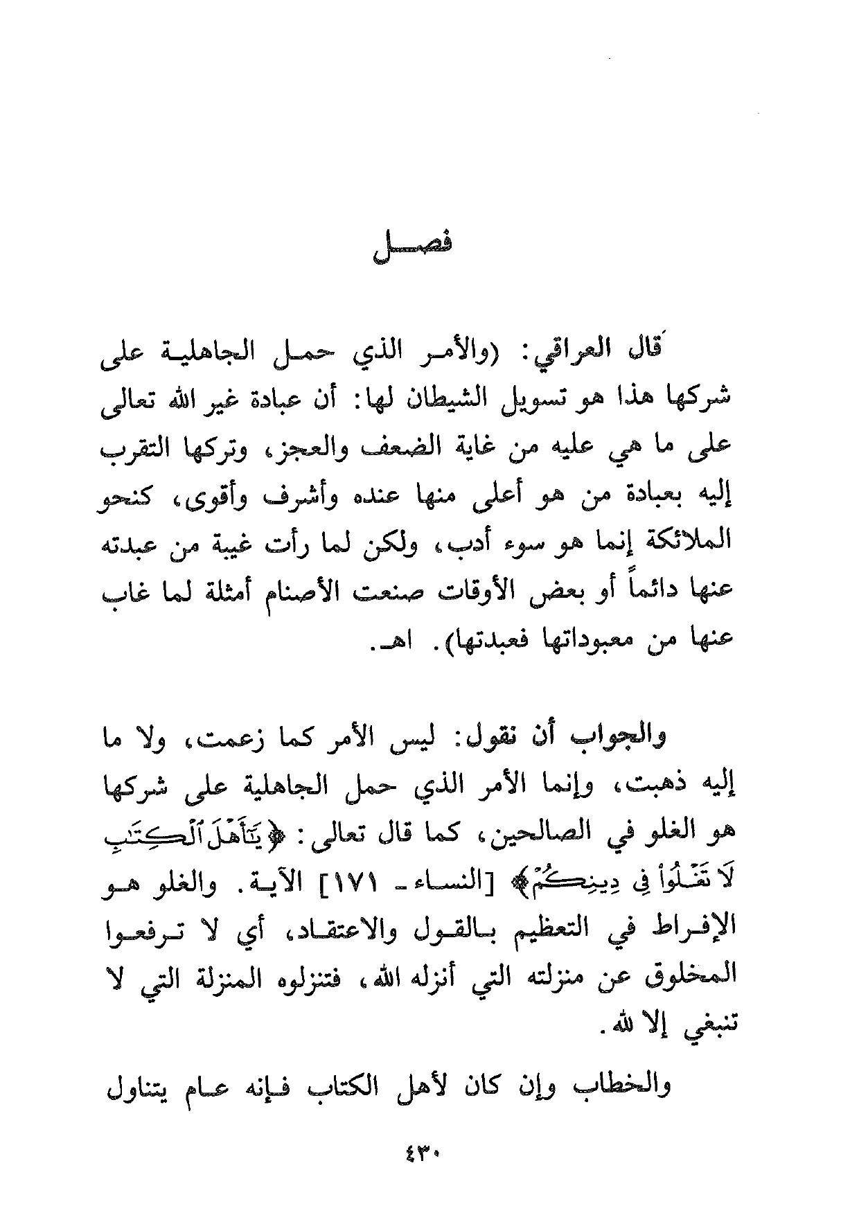 والجواب أن نقول: ليس الأمر كما زعمت، ولا ما إليه ذهبت، وإنما الأمر الذي حمل الجاهلية على شركها هو الغلو في الصالحين، كما قال تعالى: {يَا أَهْلَ الْكِتَابِ لا تَغْلُوا فِي دِينِكُمْ} [النساء: 171] الآية. والغلو هو الإفراط في التعظيم بالقول والاعتقاد، أي لا ترفعوا المخلوق عن منزلته التي أنزله الله، فتنزلوه المنزلة التي لا تنبغي إلا لله.