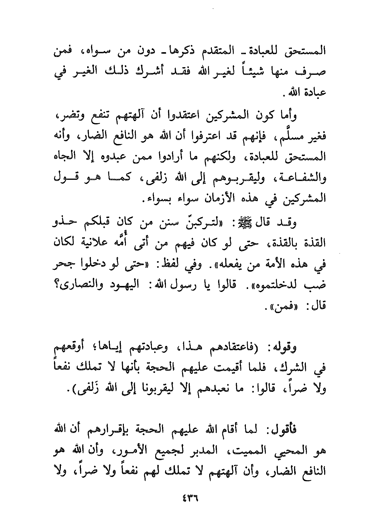 وأما كون المشركين اعتقدوا أن آلهتهم تنفع وتضر، فغير مسلم، فإنهم قد اعترفوا أن الله هو النافع الضار، وأنه المستحق للعبادة، ولكنهم ما أرادوا ممن عبدوه إلا الجاه والشفاعة، وليقربوهم إلى الله زلفى، كما هو قول المشركين في هذه الأزمان سواء بسواء.