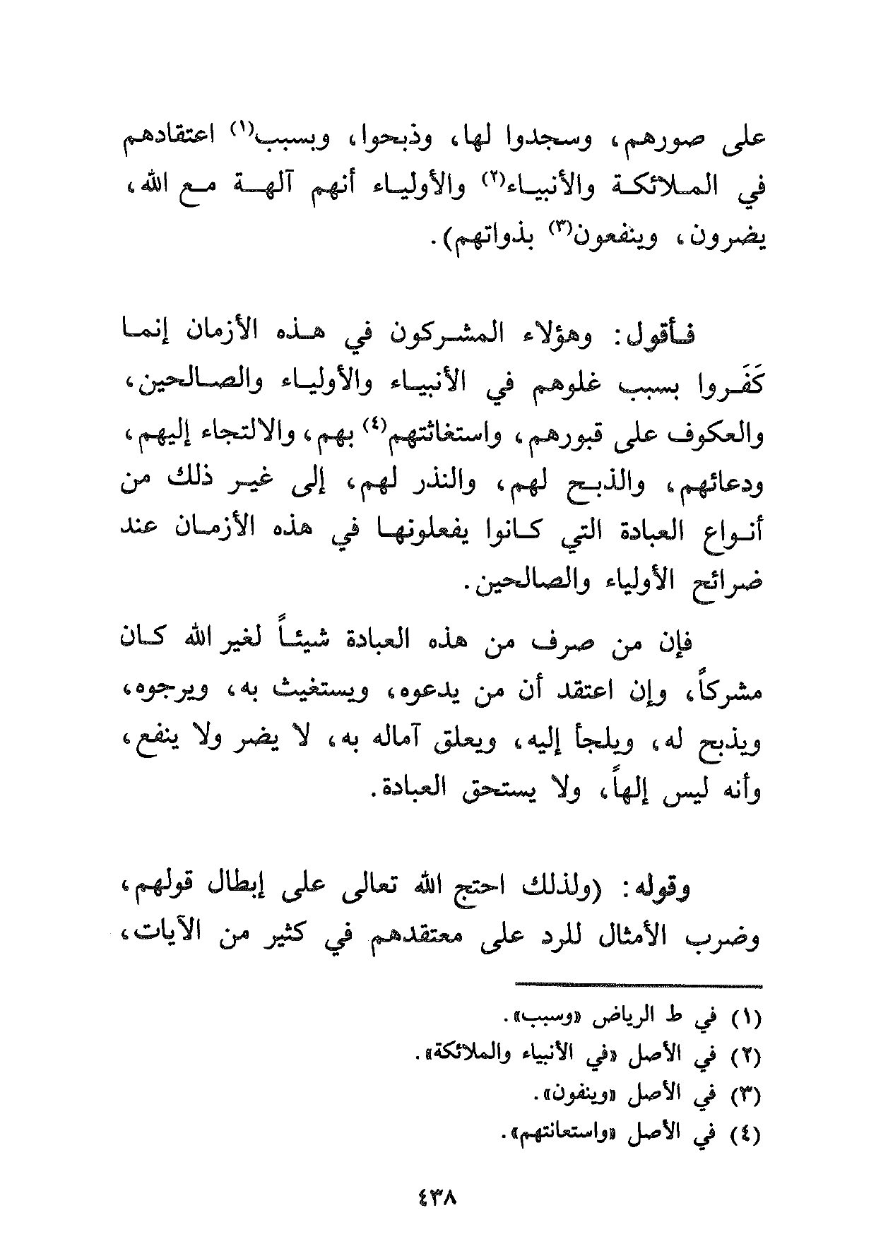 فأقول: وهؤلاء المشركون في هذه الأزمان إنما كفروا بسبب غلوهم في الأنبياء والأولياء والصالحين، والعكوف على قبورهم، واستغاثتهم4 بهم، والالتجاء إليهم، ودعائهم والذبح لهم، والنذر لهم، إلى غير ذلك من أنواع العبادة التي كانوا يفعلونها في هذه الأزمان عند ضرائح الأولياء والصالحين.