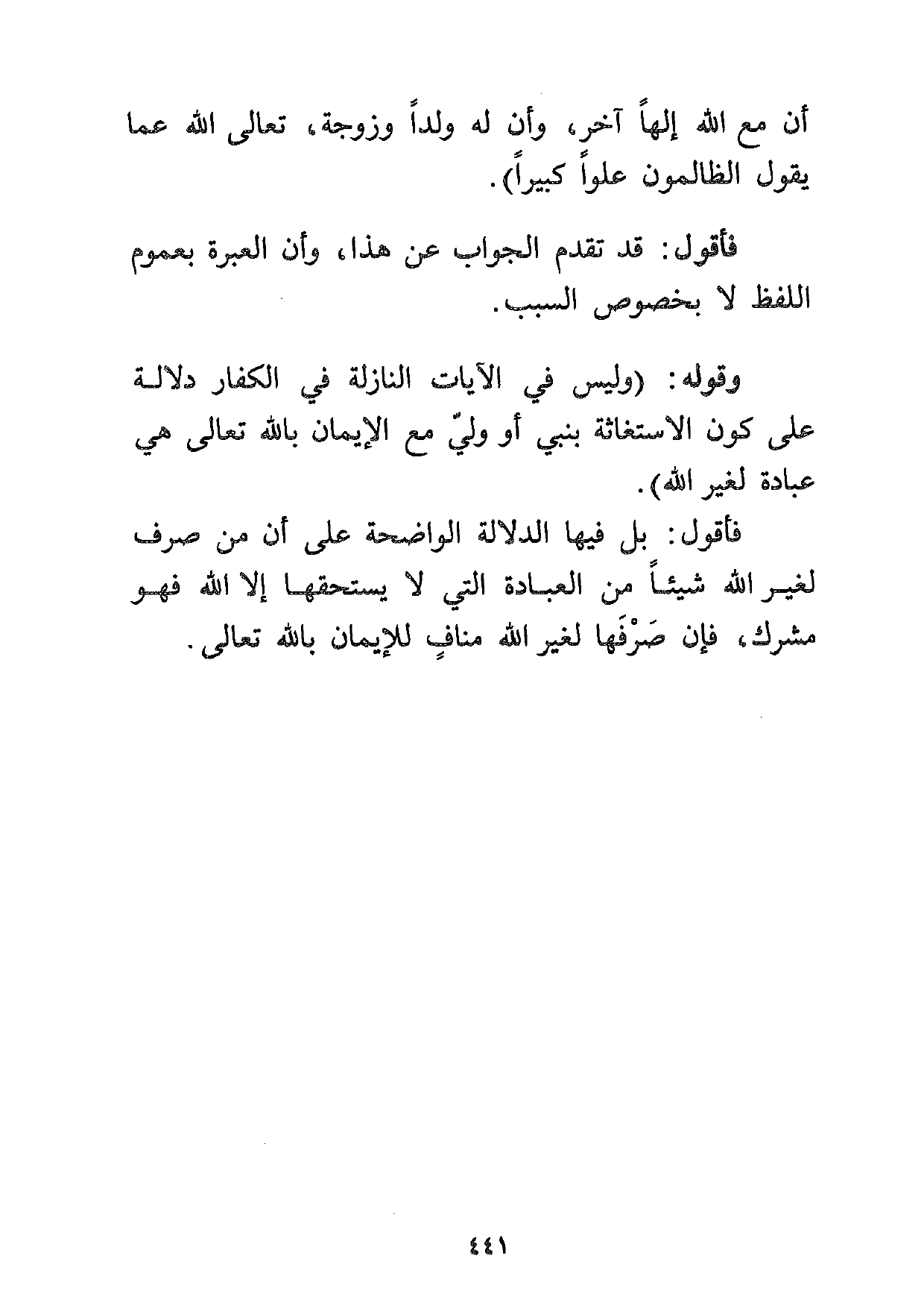 فأقول: بل فيها الدلالة الواضحة على أن من صرف لغير الله شيئاً من العبادة التي لا يستحقها إلا الله فهو مشرك، فإن صرفها لغير الله مناف للإيمان بالله تعالى.