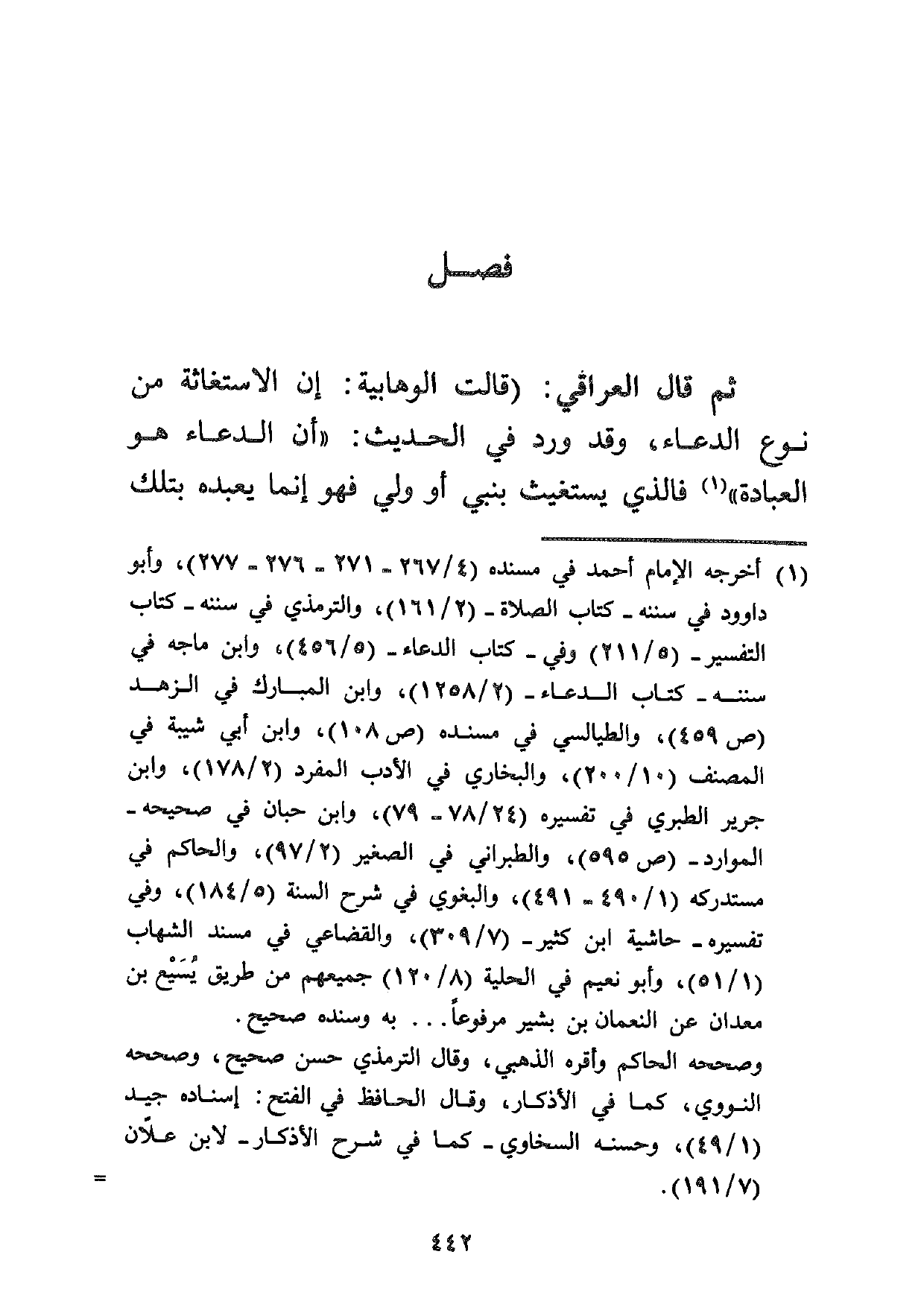 ثم قال العراقي: (قالت الوهابية: إن الاستغاثة من نوع الدعاء، وقد ورد في الحديث: "أن الدعاء هو العبادة" 1 فالذي يستغيث بنبي أو ولي فهو إنما يعبده بتلك