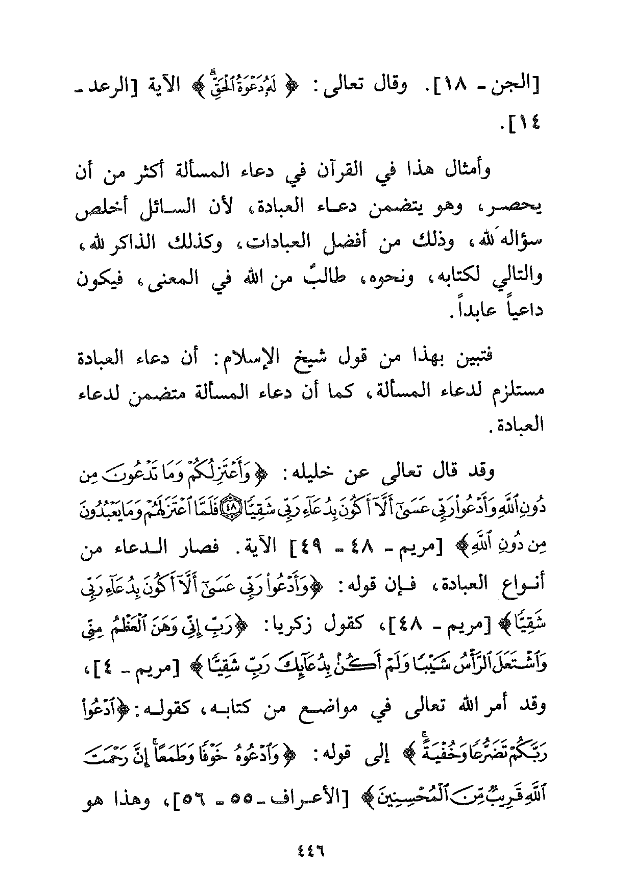 وقد قال تعالى عن خليله: {وَأَعْتَزِلُكُمْ وَمَا تَدْعُونَ مِنْ دُونِ اللَّهِ وَأَدْعُو رَبِّي عَسَى أَلَّا أَكُونَ بِدُعَاءِ رَبِّي شَقِيّاً. فَلَمَّا اعْتَزَلَهُمْ وَمَا يَعْبُدُونَ مِنْ دُونِ اللَّهِ} [مريم:48-49] . الآية. فصار الدعاء من أنواع العبادة، فإن قوله: {وَأَدْعُو رَبِّي عَسَى أَلَّا أَكُونَ بِدُعَاءِ رَبِّي شَقِيّاً} [مريم: 48] . كقول زكريا: {قَالَ رَبِّ إِنِّي وَهَنَ الْعَظْمُ مِنِّي وَاشْتَعَلَ الرَّأْسُ شَيْباً وَلَمْ أَكُنْ بِدُعَائِكَ رَبِّ شَقِيّاً} [مريم:4] ، وقد أمر الله تعالى في مواضع من كتابه، كقوله: {ادْعُوا رَبَّكُمْ تَضَرُّعاً وَخُفْيَةً} إلى قوله: {وَادْعُوهُ خَوْفاً وَطَمَعاً إِنَّ رَحْمَتَ اللَّهِ قَرِيبٌ مِنَ الْمُحْسِنِينَ} [الأعراف: 55-56] ، وهذا هو