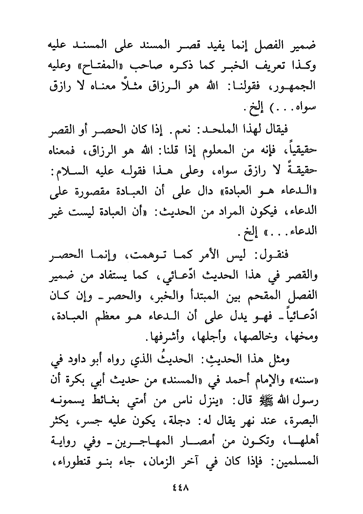 فيقال لهذا الملحد: نعم إذا كان الحصر أو القصر حقيقياً، فإنه من المعلوم إذا قلنا: الله هو الرازق، فمعناه حقيقة لا رازق سواه، وعلى هذا فقوله عليه السلام: "الدعاء هو العبادة" دال على أن العبادة مقصورة على الدعاء، فيكون المراد من الحديث: "أن العبادة ليست غير الدعاء ... " الخ.