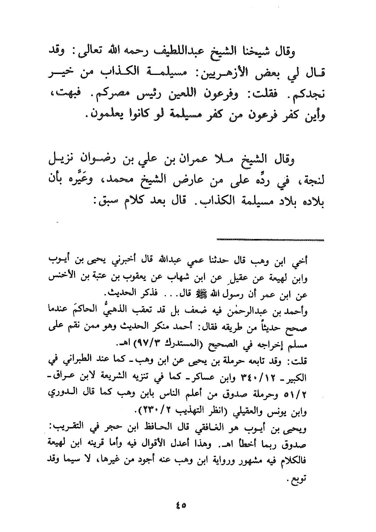 وقال شيخنا الشيخ عبد اللطيف رحمه الله تعالى: وقد قال لي بعض الأزهريين: مسيلمة الكذاب من خير نجدكم. فقلت: وفرعون اللعين رئيس مصركم. فبهت، وأين كفر فرعون من كفر مسيلمة لو كانوا يعلمون.