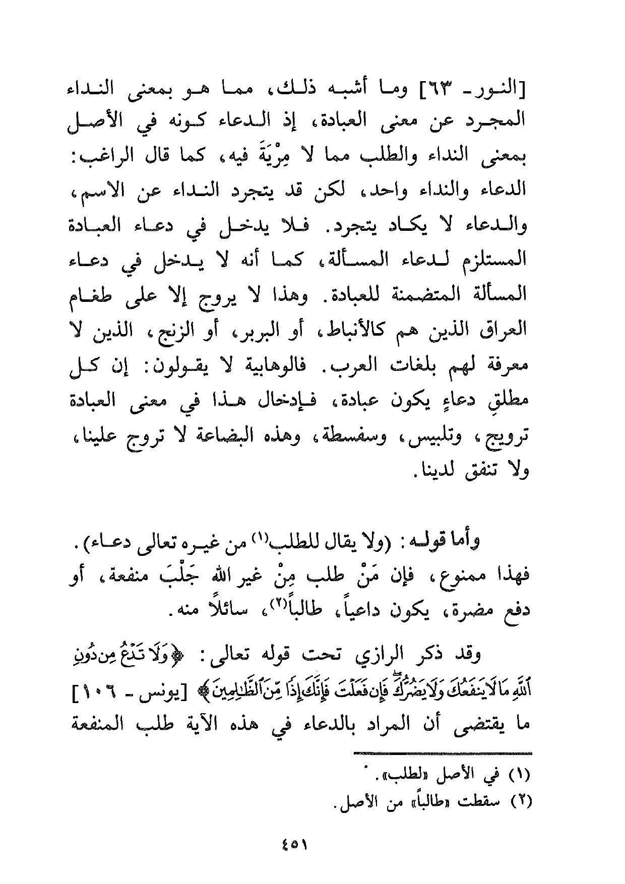 [النور: 63] وما أشبه ذلك، مما هو بمعنى النداء المجرد عن معنى العبادة، إذ الدعاء كونه في الأصل بمعنى النداء والطلب مما لا مرية فيه، كما قال الراغب: الدعاء والنداء واحد، لكن قد يتجرد النداء عن الاسم، والدعاء لا يكاد يتجرد. فلا يدخل في دعاء العبادة المستلزم لدعاء المسألة، كما أنه لا يدخل في دعاء المسألة المتضمنة للعبادة. وهذا لا يروج إلى على طغام العراق الذين هم كالأنباط، أو البربر، أو الزنج، الذين لا معرفة لهم بلغات العرب. فالوهابية لا يقولون: إن كل مطلق دعاء يكون عبادة، فإدخال هذا في معنى العبادة ترويج وتلبيس وسفسطة، وهذه البضاعة لا تروج علينا، ولا تنفق لدينا.