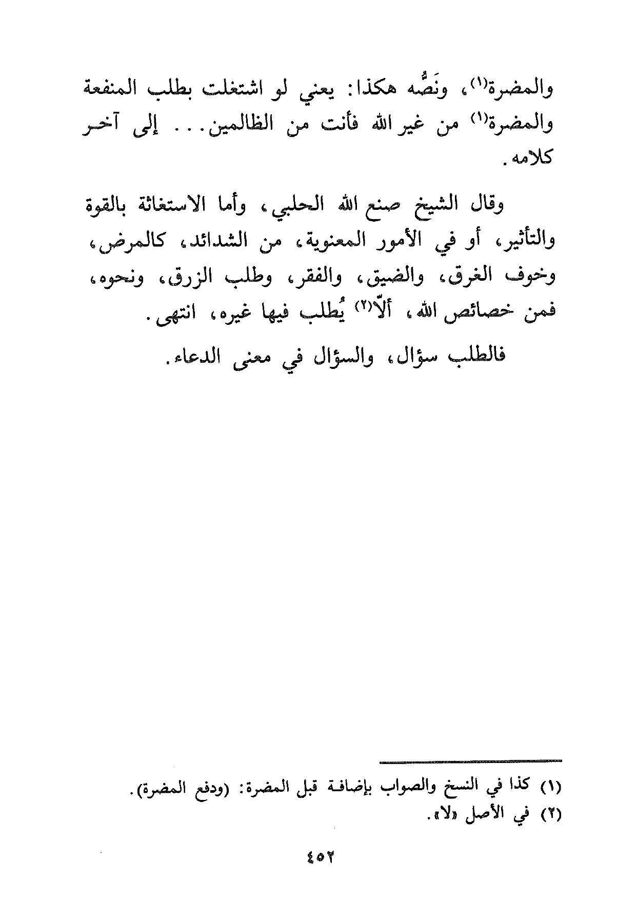 وقال الشيخ صنع الله الحلبي، وأما الاستغاثة بالقوة والتأثير، أو في الأمور المعنوية من الشدائد كالمرض وخوف الغرق، والضيق والفقر وطلب الرزق، ونحوه، فمن خصائص الله، ألا3 يطلب فيها غيره. انتهى.