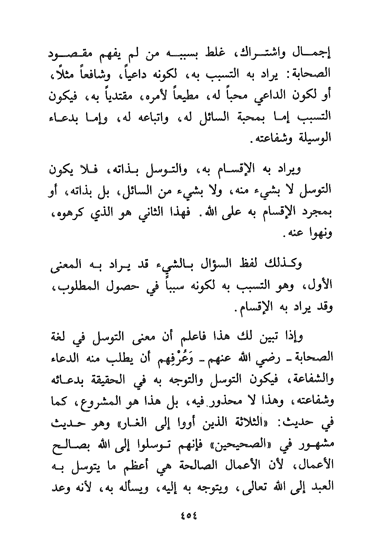 وإذا تبين لك هذا فاعلم أن معنى التوسل في لغة الصحابة رضي الله عنهم وعرفهم أن يطلب منه الدعاء والشفاعة، فيكون التوسل والتوجه به في الحقيقة بدعائه وشفاعته، وهذا لا محذور فيه، بل هذا هو المشروع، كما في حديث: "الثلاثة الذين أووا إلى الغار" وهو حديث مشهور في "الصحيحين" فإنهم توسلوا إلى الله بصالح الأعمال، لأن الأعمال الصالحة هي أعظم ما يتوسل به العبد إلى الله تعالى، ويتوجه به إليه، ويسأله به، لأنه وعد