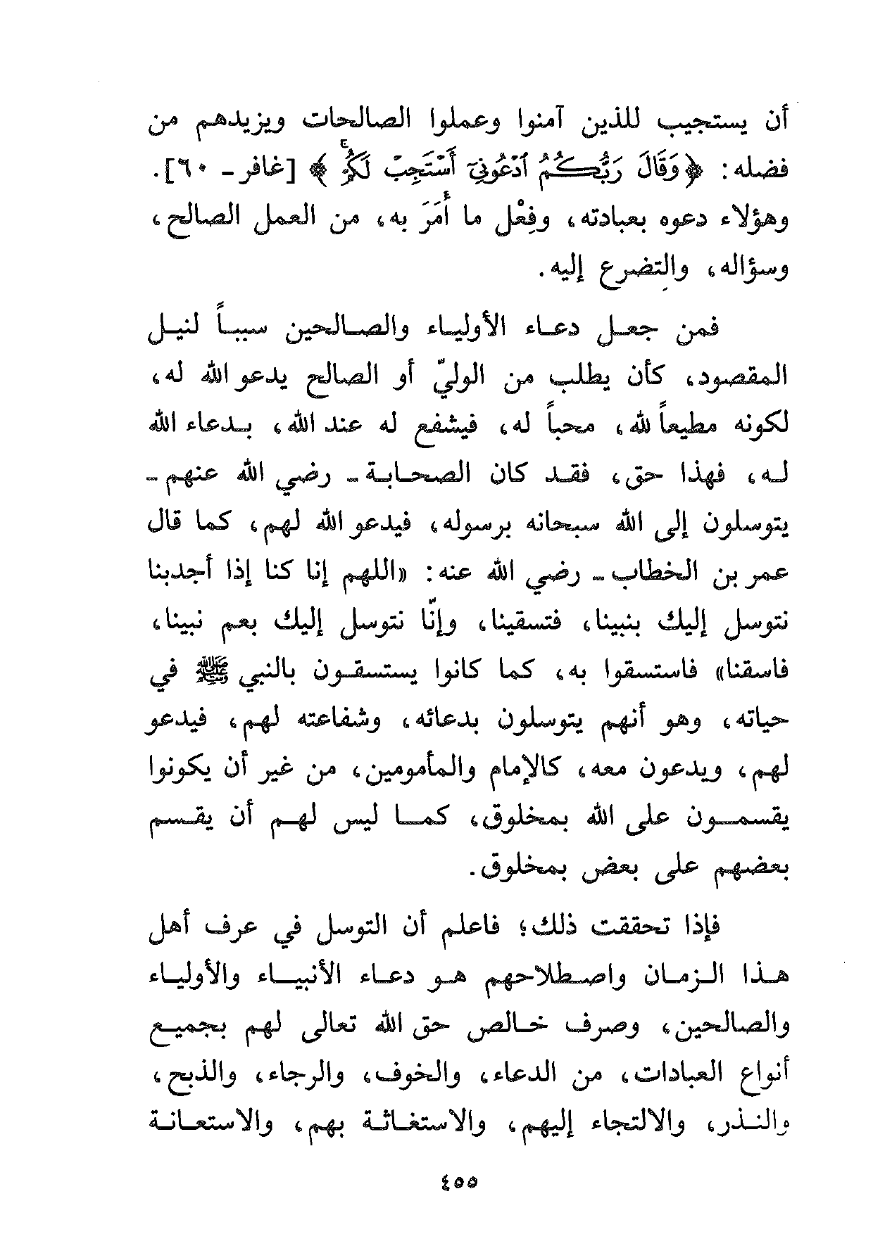 فمن جعل دعاء الأولياء والصالحين سبباً لنيل المقصود، كأن يطلب من الولي أو الصالح يدعو الله له، لكونه مطيعاً لله، محباً له، فيشفع له عند الله، بدعاء الله له، فهذا حق، فقد كان الصحابة رضي الله عنهم يتوسلون إلى الله سبحانه برسوله، فيدعو الله لهم، كما قال عمر بن الخطاب رضي الله عنه: "اللهم إنا كنا إذا أجدبنا نتوسل إليك بنبينا، فتسقينا، وإنا نتوسل إليك بعم نبينا، فاسقنا"، فاستسقوا به، كما كانوا يستسقون بالنبي صلى الله عليه وسلم في حياته، وهو أنهم يتوسلون بدعائه وشفاعته لهم، فيدعو لهم، ويدعون معه، كالإمام والمأمومين، من غير أن يكونوا يقسمون على الله بمخلوق، كما ليس لهم أن يقسم بعضهم على بعض بمخلوق.