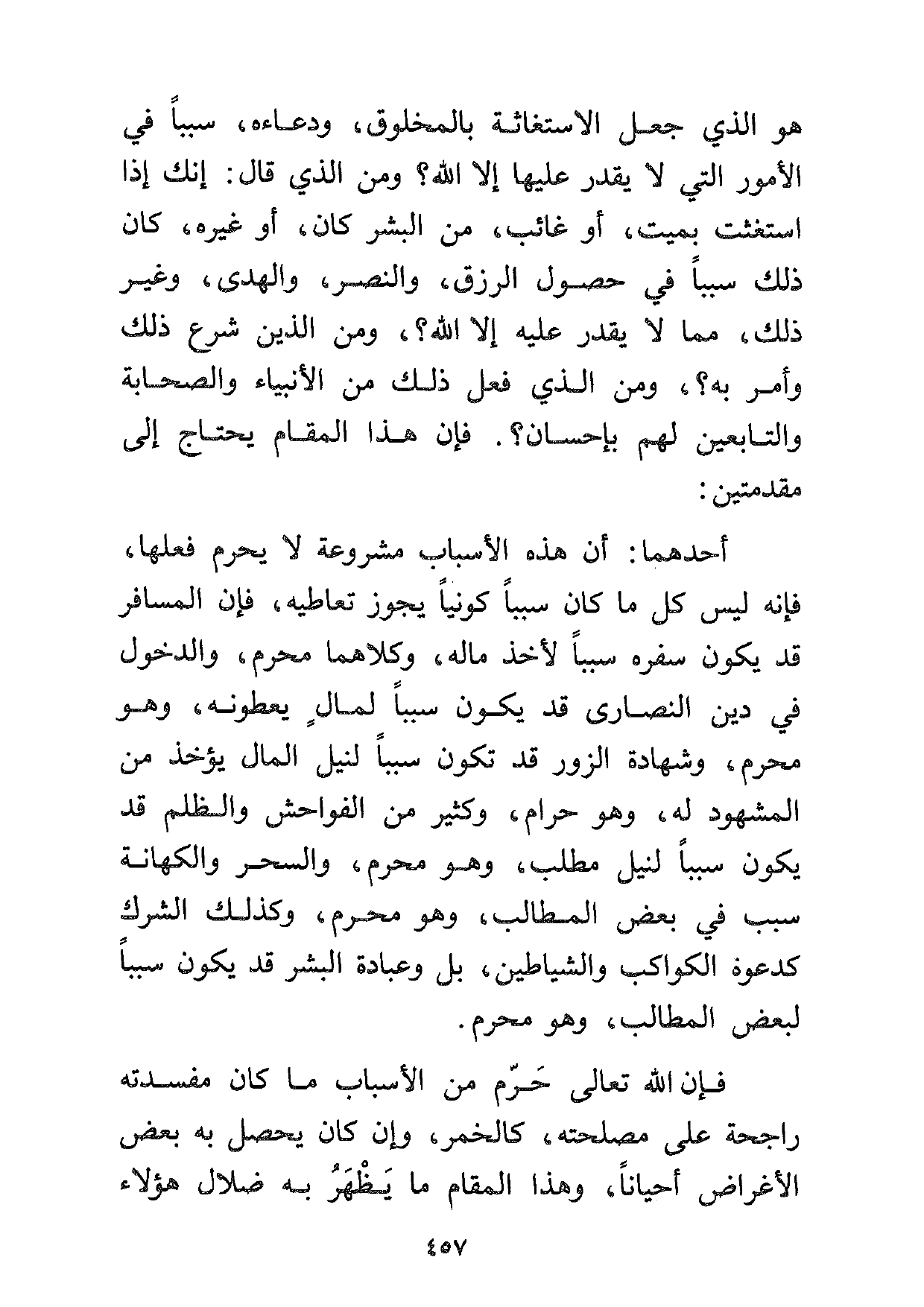 أحدهما: أن هذه الأسباب مشروعة لا يحرم فعلها، فإنه ليس كل ما كان سبباً كونياً يجوز تعاطيه، فإن المسافر قد يكون سفره سبباً لأخذ ماله، وكلاهما محرم، والدخول في دين النصارى قد يكون سبباً لمال يعطونه، وهو محرم، وشهادة الزور قد تكون سبباً لنيل المال يؤخذ من المشهود له، وهو حرام، وكثير من الفواحش والظلم قد يكون سبباً لنيل مطلب، وهو محرم، والسحر والكهانة سبب في بعض المطالب، وهو محرم، وكذلك الشرك كدعوة الكواكب والشياطين، بل وعبادة البشر قد يكون سبباً لبعض المطالب، وهو محرم.