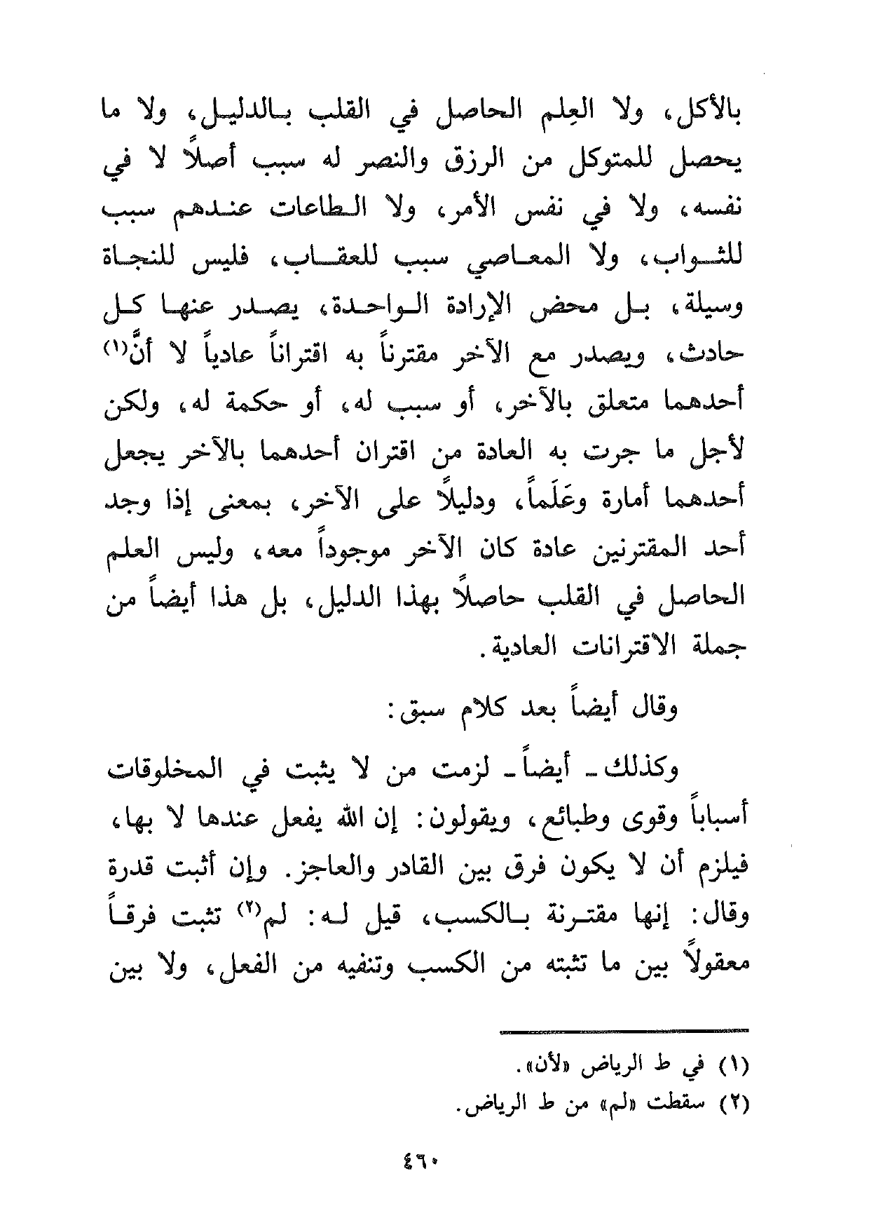 بالأكل، ولا العلم الحاصل في القلب بالدليل، ولا ما يحصل للمتوكل من الرزق والنصر له سبب أصلاً لا في نفسه، ولا في نفس الأمر، ولا الطاعات عندهم سبب للثواب، ولا المعاصي سبب للعقاب، فليس للنجاة وسيلة، بل محض الإرادة الواحدة يصدر عنها كل حادث، ويصدر مع الآخر مقترناً به اقتراناً عادياً لا أن1 أحدهما متعلق بالآخر، أو سبب له، أو حكمة له، ولكن لأجل ما جرت به العادة من اقتران أحدهما بالآخر يجعل أحدهما أمارة وعلماً ودليلاً على الآخر، بمعنى إذا وجد أحد المقترنين عادة كان الآخر موجوداً معه، وليس العلم الحاصل في القلب حاصلاً بهذا الدليل، بل هذا أيضاً من جملة الاقترانات العادية.