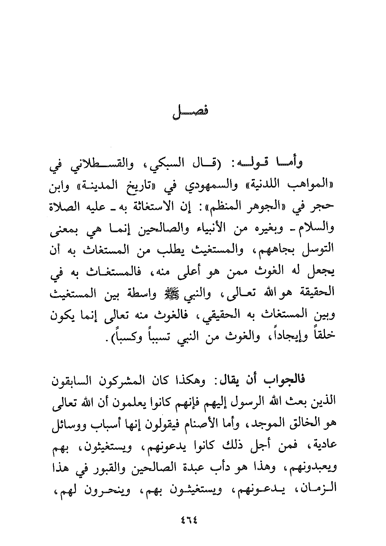 وأما قوله: (قال السبكي، والقسطلاني في "المواهب اللدنية" والسمهودي في "تاريخ المدينة" وابن حجر في "الجوهر المنظم": إن الاستغاثة به -عليه الصلاة والسلام- وبغيره من الأنبياء والصالحين إنما هي بمعنى التوسل بجاههم، والمستغيث يطلب من المستغاث به أن يجعل له الغوث ممن هو أعلى منه، فالمستغاث به في الحقيقة هو الله تعالى، والنبي صلى الله عليه وسلم واسطة بين المستغيث وبين المستغاث به الحقيقي، فالغوث منه تعالى إنما يكون خلقاً وإيجاداً، والغوث من النبي تسبباً وكسباً) .