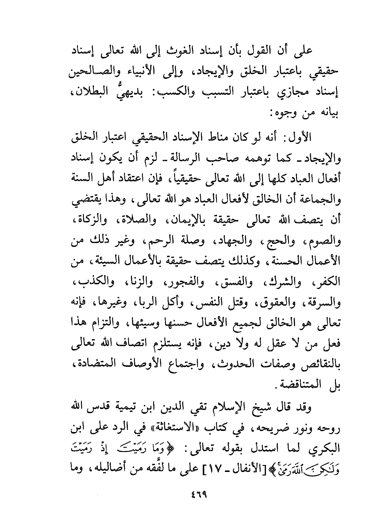 وقد قال شيخ الإسلام تقي الدين ابن تيمية قدس الله روحه ونور ضريحه، في كتاب "الاستغاثة" في الرد على ابن البكري لما استدل بقوله تعالى: {وَمَا رَمَيْتَ إِذْ رَمَيْتَ وَلَكِنَّ اللَّهَ رَمَى} [الأنفال: 17] على ما لفقه من أضاليله، وما