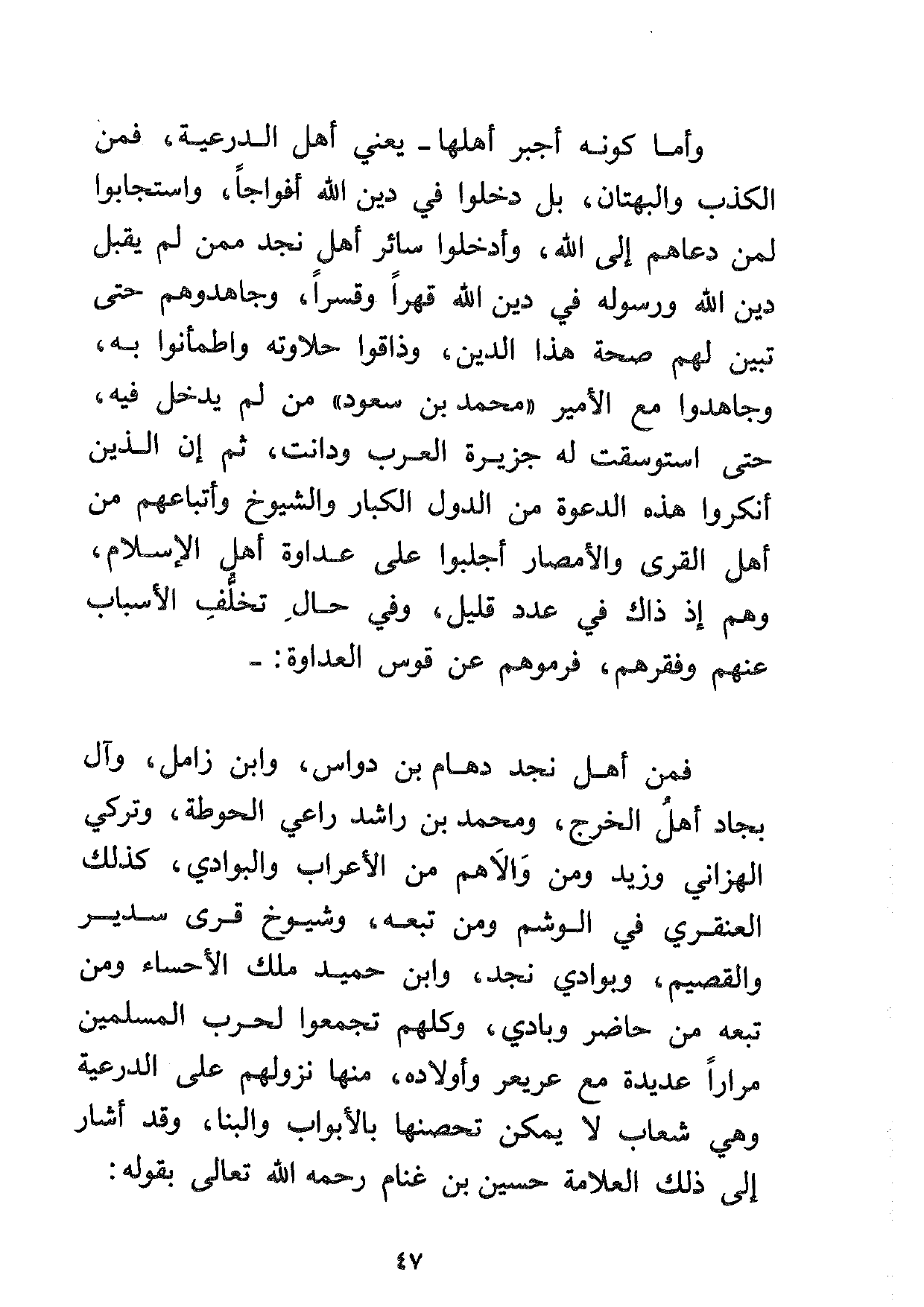 وأما كونه أجبر أهلها –يعني أهل الدرعية، فمن الكذب والبهتان، بل دخلوا في دين الله أفواجاً، واستجابوا لمن دعاهم إلى الله، وأدخلوا سائر أهل نجد ممن لم يقبل دين الله ورسوله في دين الله قهراً وقسراً، وجاهدوهم حتى تبين لهم صحة هذا الدين، وذاقوا حلاوته واطمأنوا به، وجاهدوا مع الأمير "محمد بن سعود" من لم يدخل فيه، حتى استوسقت له جزيرة العرب ودانت، ثم إن الذين أنكروا هذه الدعوة من الدول الكبار والشيوخ وأتباعهم من أهل القرى والأمصار، أجلبوا على عداوة أهل الإسلام، وهم إذ ذاك في عدد قليل، وفي حال تخلف الأسباب عنهم وفقرهم، فرموهم عن قوس العداوة:-