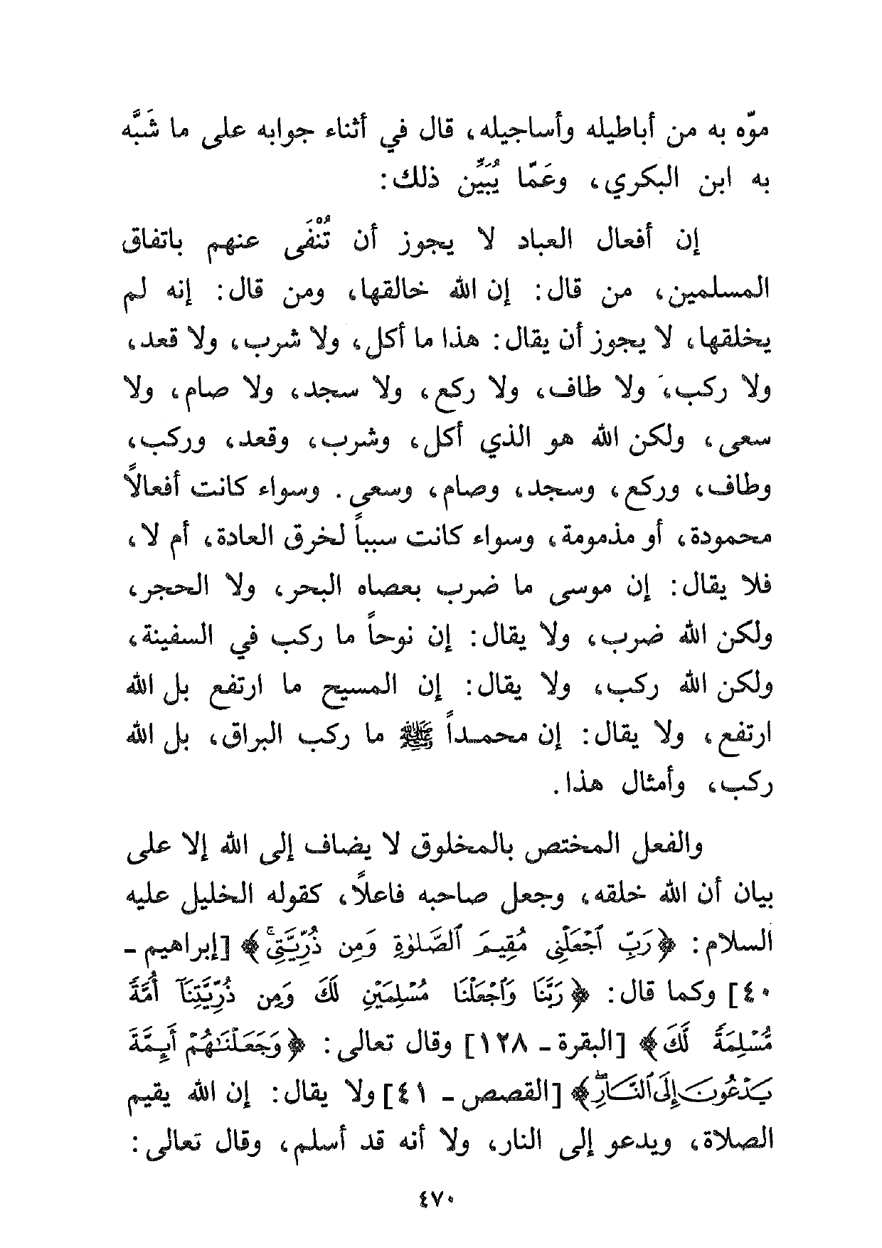 إن أفعال العباد لا يجوز أن تنفى عنهم باتفاق المسلمين، من قال: إن الله خالقها، ومن قال: إنه لم يخلقها، لا يجوز أن يقال: هذا ما أكل، ولا شرب، ولا قعد، ولا ركب ولا طاف، ولا ركع ولا سجد، ولا صام ولا سعى، ولكن الله هو الذي أكل وشرب وقعد وركب وطاف وركع وسجد، وصام وسعى. وسواء كانت أفعالاً محمودة أو مذمومة، وسواء كانت سبباً لخرق العادة، أم لا، فلا يقال إن موسى ما ضرب بعصاه البحر، ولا الحجر، ولكن الله ضرب، ولا يقال: إن نوحاً ما ركب في السفينة، ولكن الله ركب، ولا يقال: إن المسيح ما ارتفع، بل الله ارتفع، ولا يقال إن محمدا صلى الله عليه وسلم ما ركب البراق، بل الله ركب، وأمثال هذا.