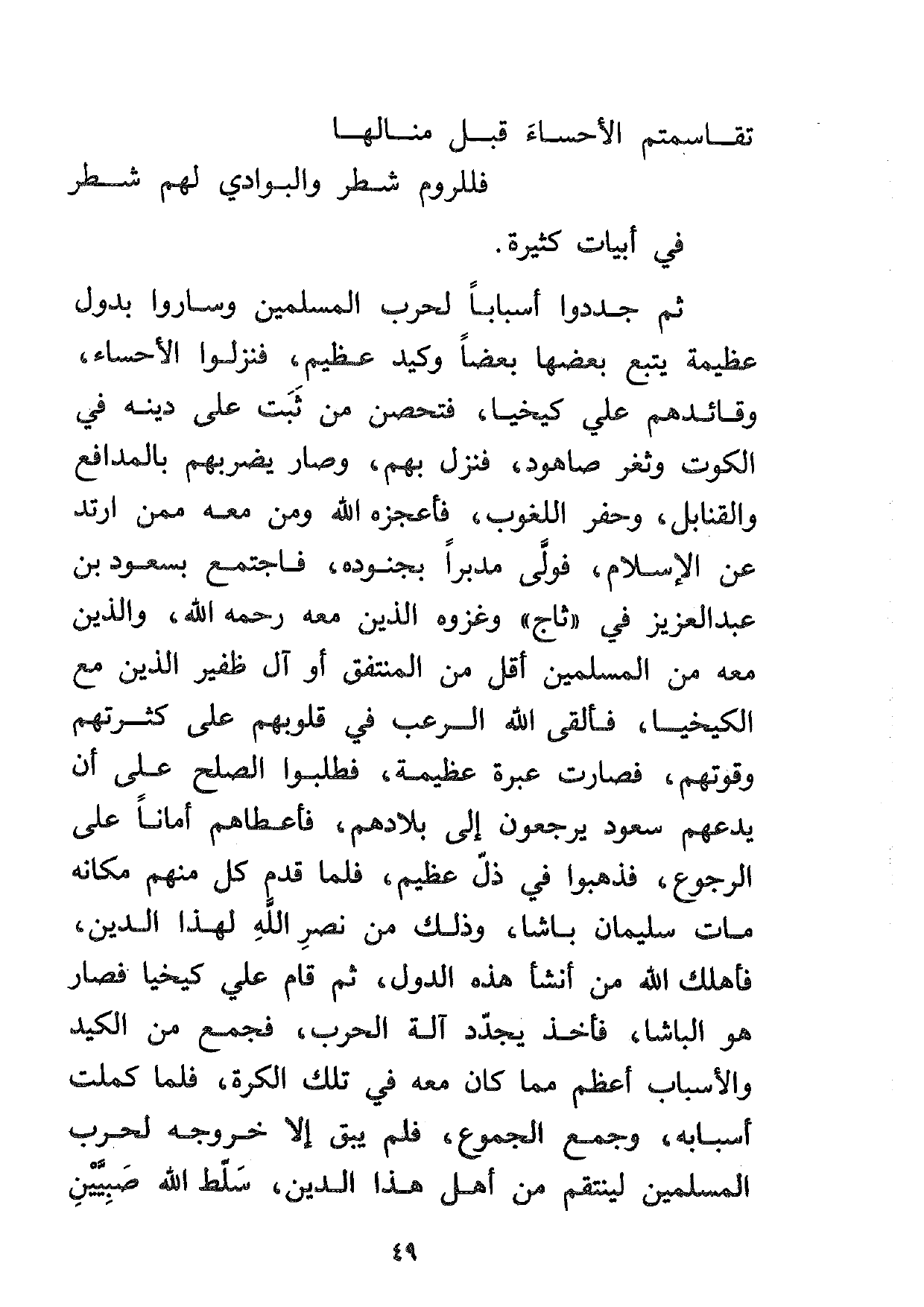 ثم جددوا أسباباً لحرب المسلمين وساروا بدول عظيمة يتبع بعضها بعضاً وكيد عظيم، فنزلوا الأحساء، وقائدهم علي كيخيا، فتحصن من ثبت على دينه في الكوت وثغر صاهود، فنزل بهم، وصار يضربهم بالمدافع والقنابل، وحفر اللغوب، فأعجزه الله ومن معه ممن ارتد عن الإسلام، فولى مدبراً بجنوده، فاجتمع بسعود بن عبد العزيز في "ثاج" وعزوه الذي معه رحمه الله، والذين معه من المسلمين أقل من المنتفق أو آل ظفير الذين مع الكيخيا، فألقى الله الرعب في قلوبهم على كثرتهم وقوتهم، فصارت عبرة عظيمة، فطلبوا الصلح على أن يدعهم سعود يرجعون إلى بلادهم، فأعطاهم أماناً على الرجوع، فذهبوا في ذل عظيم، فلما قدم كل منهم مكانه مات سليمان باشا، وذلك من نصر الله لهذا لدين، فأهلك الله من أنشأ هذه الدول، ثم قام علي كيخيا فصار هو الباشا، فأخذ يجدد آلة الحرب، فجمع من الكيد والأسباب أعظم مما كان معه في تلك الكرة، فلما كملت أسبابه وجمع الجموع، فلم يبق إلا خروجه لحرب المسلمين لينتقم من أهل هذا الدين، سلط الله صبيين