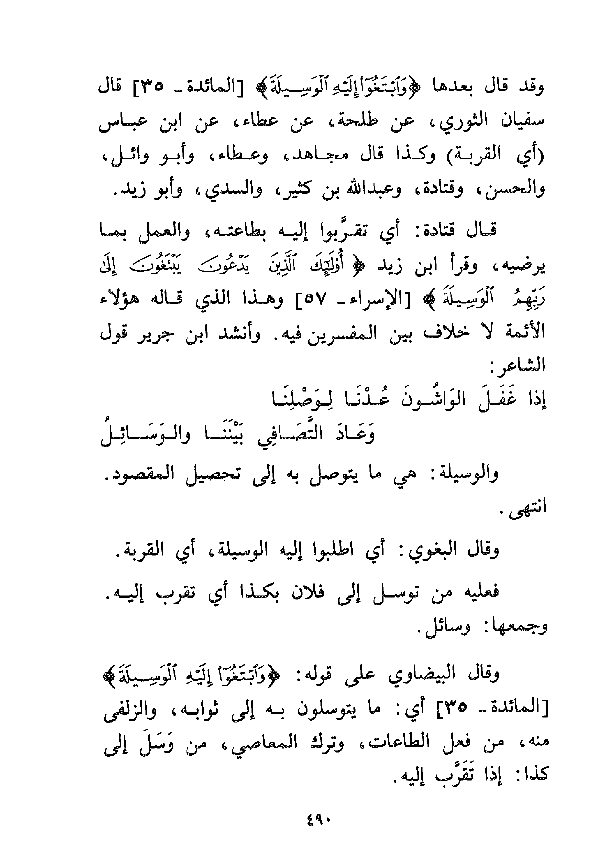وقد قال بعدها: {وَابْتَغُوا إِلَيْهِ الْوَسِيلَةَ} [المائدة: 35] ، قال سفيان الثوري، عن طلحة عن عطاء عن ابن عباس (أي القربة) ، وكذا قال مجاهد وعطاء وأبو وائل، والحسن وقتادة وعبد الله بن كثير، والسدي وأبو زيد.