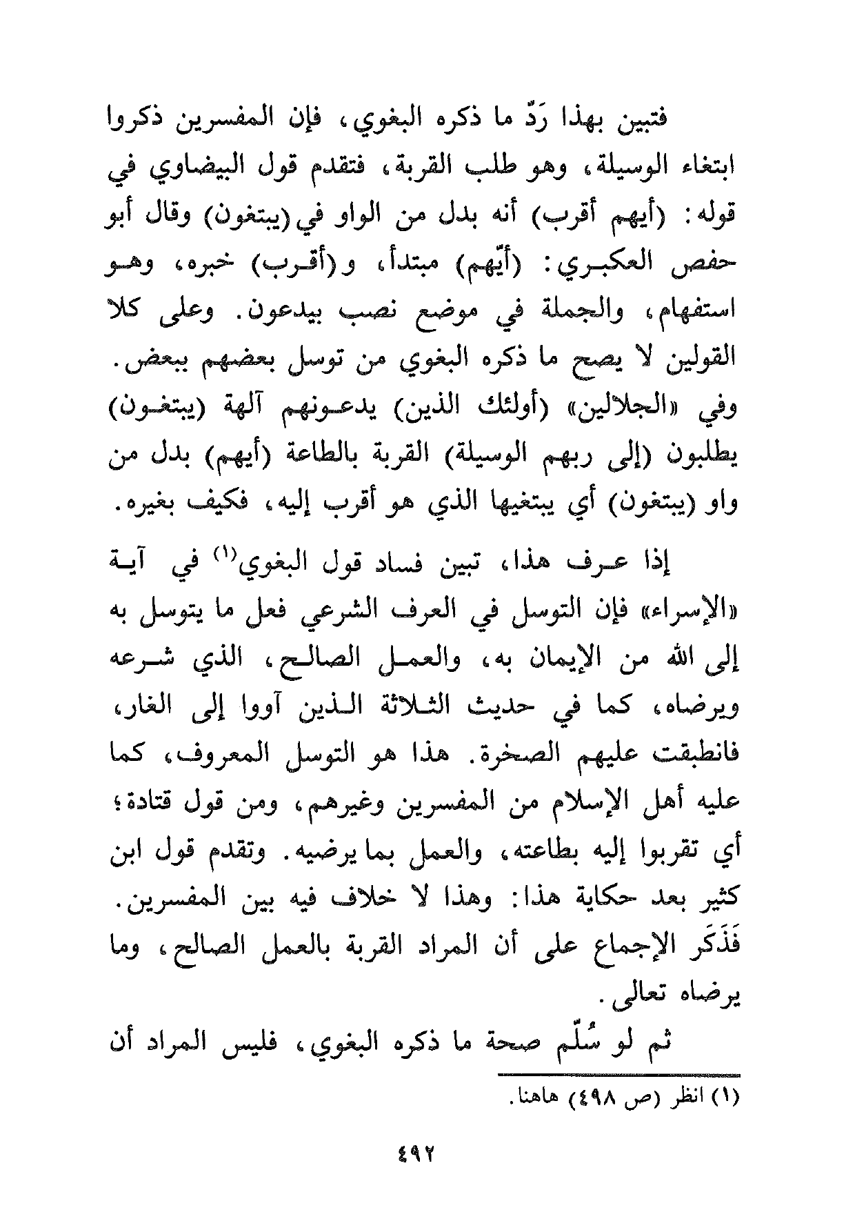 إذا عرف هذا، تبين فساد قول البغوي1 في آية "الإسراء" فإن التوسل في العرف الشرعي فعل ما يتوسل به إلى الله من الإيمان به، والعمل الصالح، الذي شرعه ويرضاه، كما في حديث الثلاثة الذين آووا إلى الغار، فانطبقت عليهم الصخرة. هذا هو التوسل المعروف، كما عليه أهل الإسلام من المفسرين وغيرهم، ومن قول قتادة؛ أي تقربوا إليه بطاعته، والعمل بما يرضيه. وتقدم قول ابن كثير بعد حكاية هذا: وهذا لا خلاف فيه بين المفسرين. فذكر الإجماع على أن المراد القربة بالعمل الصالح، وما يرضاه تعالى.