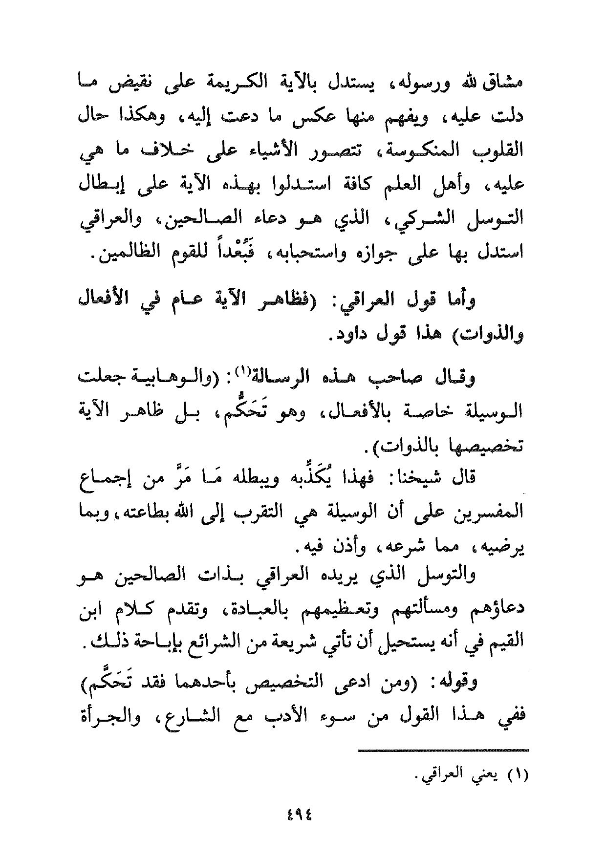 مشاق لله ورسوله، يستدل بالآية الكريمة على نقيض ما دلت عليه، ويفهم منها عكس ما دعت إليه، وهكذا حال القلوب المنكوسة، تتصور الأشياء على خلاف ما هي عليه، وأهل العلم كافة استدلوا بهذه الآية على إبطال التوسل الشركي، الذي هو دعاء الصالحين، والعراقي استدل بها على جوازه واستحبابه، فبعداً للقوم الظالمين.