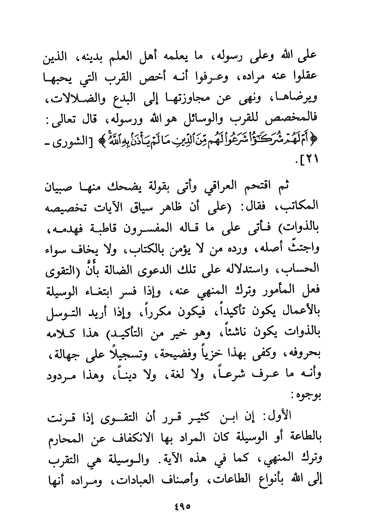 ثم اقتحم العراقي وأتى بقولة يضحك منها صبيان المكاتب، فقال: (على أن ظاهر سياق الآيات تخصيصه بالذوات) فأتى على ما قاله المفسرون قاطبة فهدمه، واجتث أصله، ورده من لا يؤمن بالكتاب، ولا يخاف سواء الحساب، واستدلاله على تلك الدعوى الضالة بأن (التقوى فعل المأمور وترك المنهي عنه، وإذا فسر ابتغاء الوسلية بالأعمال يكون تأكيداً فيكون مكرراً، وإذا أريد التوسل بالذوات يكون ناشئاً، وهو خير من التأكيد) هذا كلامه بحروفه، وكفى بهذا خزياً وفضيحة، وتسجيلاً على جهالة، وأنه ما عرف شرعاً، ولا لغة، ولا ديناً، وهذا مردود بوجوه: