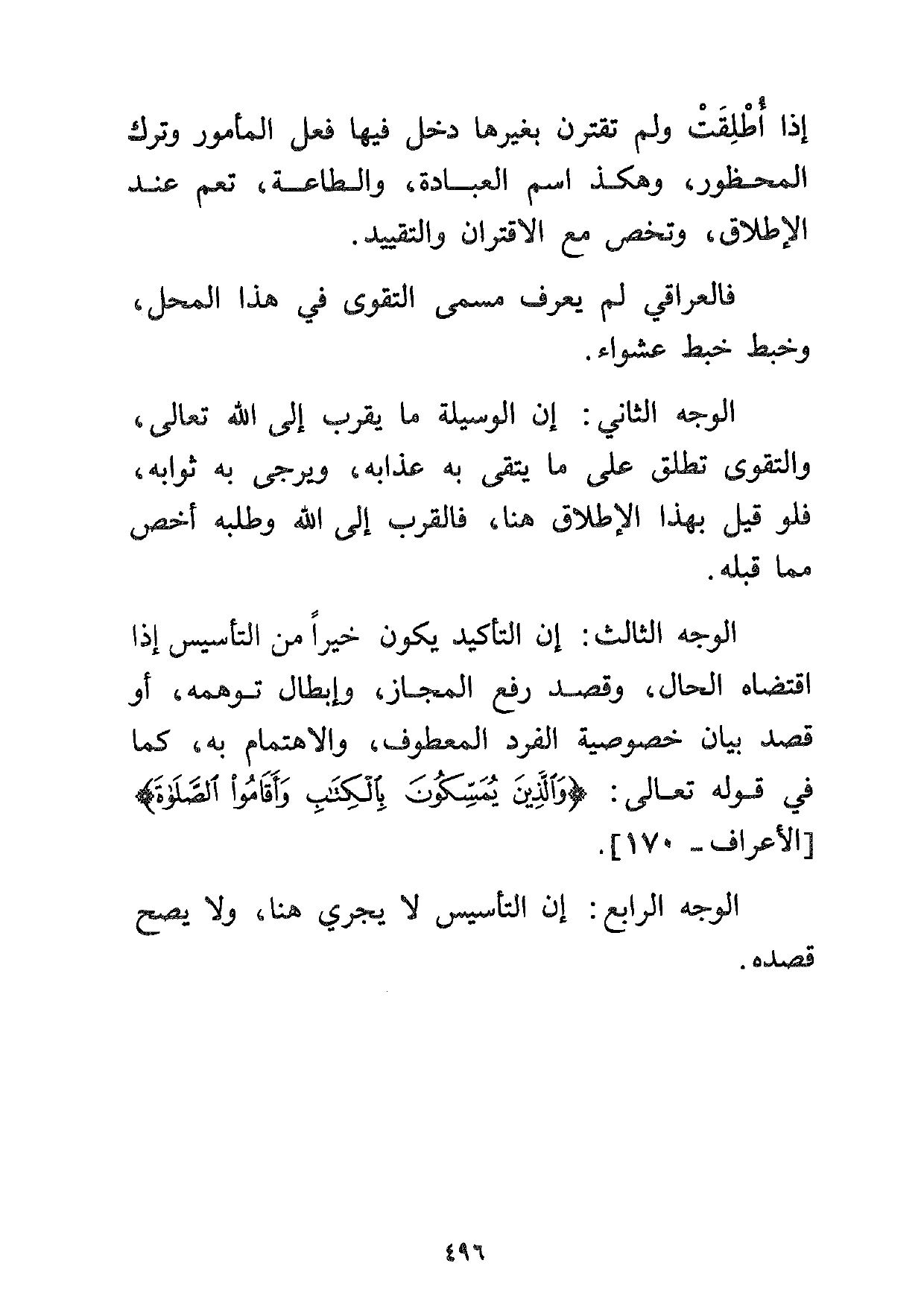 الوجه الثالث: إن التأكيد يكون خيراً من التأسيس إذا اقتضاه الحال، وقصد رفع المجاز، وإبطال توهمه، أو قصد بيان خصوصية الفرد المعطوف، والاهتمام به، كما في قوله تعالى: {وَالَّذِينَ يُمَسِّكُونَ بِالْكِتَابِ وَأَقَامُوا الصَّلاة} [الأعراف: 170] .