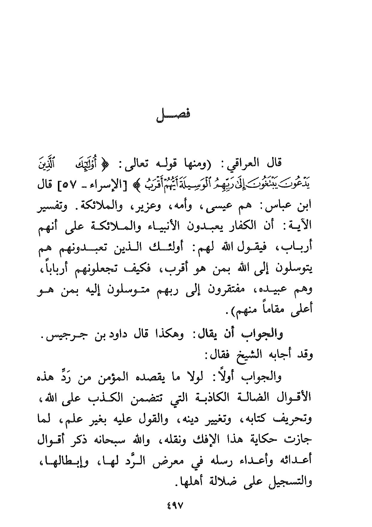 قال العراقي: (ومنها قوله تعالى: {أُولَئِكَ الَّذِينَ يَدْعُونَ يَبْتَغُونَ إِلَى رَبِّهِمُ الْوَسِيلَةَ أَيُّهُمْ أَقْرَبُ} [الإسراء: 57] قال ابن عباس: هم عيسى وأمه وعزير والملائكة. وتفسير الآية: أن الكفار يعبدون الأنبياء والملائكة على أنهم أرباب، فيقول الله لهم: أولئك الذين تعبدونهم هم يتوسلون إلى الله بمن هو أقرب، فكيف تجعلونهم أرباباً، وهم عبيده مفتقرون إلى ربهم متوسلون إليه بمن هو أعلى مقاماً منهم) .
